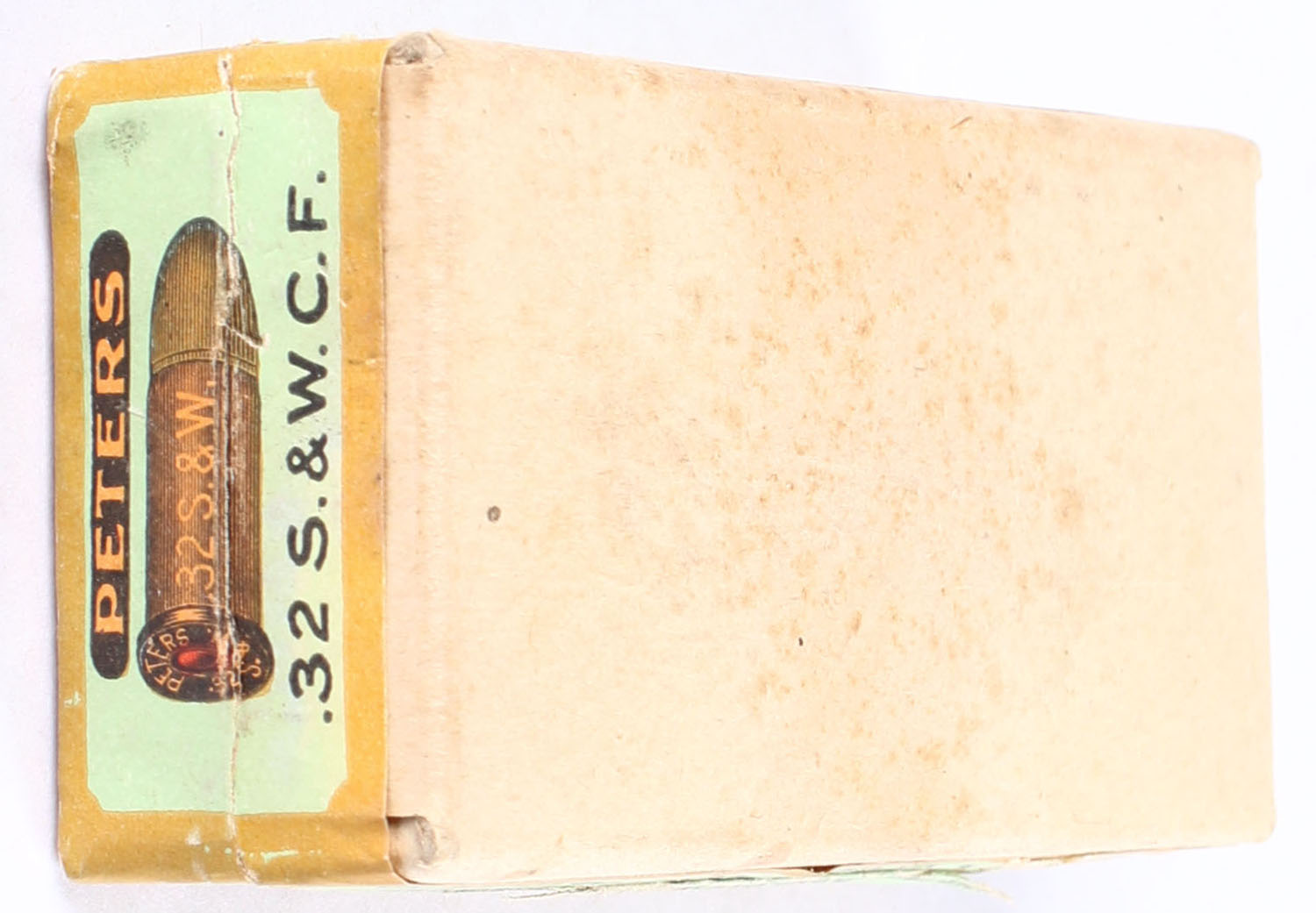 Peters, Central-Fire Cartridges, .32 Smith & Wesson, 82 Grain Solid Head Bullet, Empty, 2pc. Buff box with green/orange top & side sealing labels, box is very solid with excellent color, labels are intact. Grade: Excellent + - Value: 10 to 25