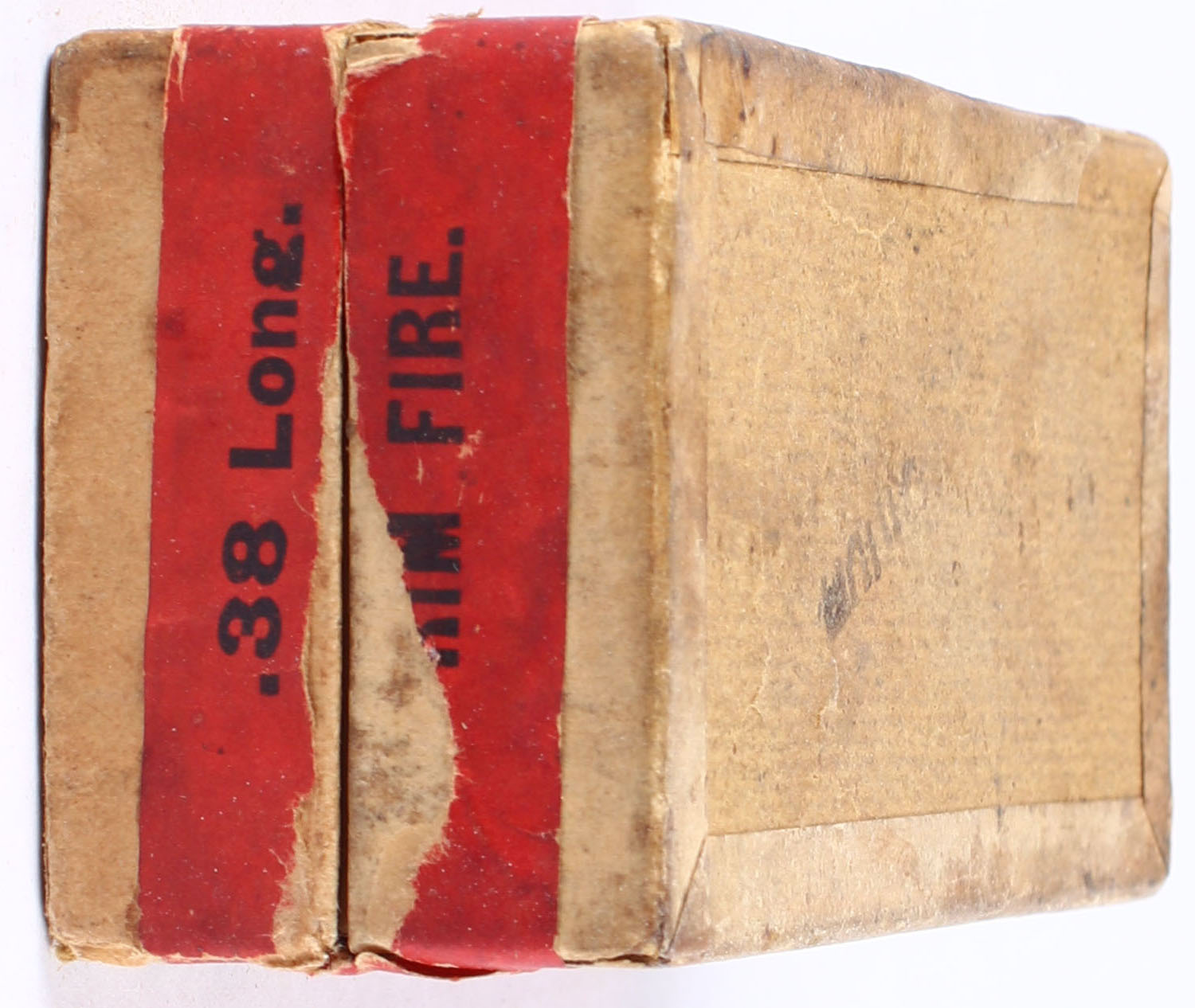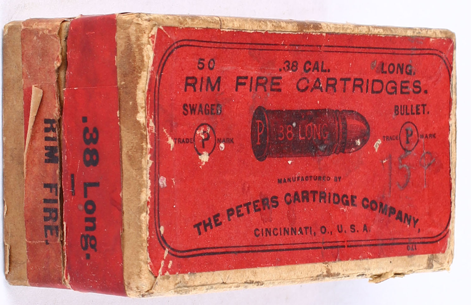 Peters, .38 Long R.F., Swaged Bullet, Smokeless Powder, 2pc, Partial 15rds of mixed H/S, buff box with red label & black print, box has age soiling with edge wear, has some scuffing, ammo is fair. Grade: Good ++ - Value: 16 to 30