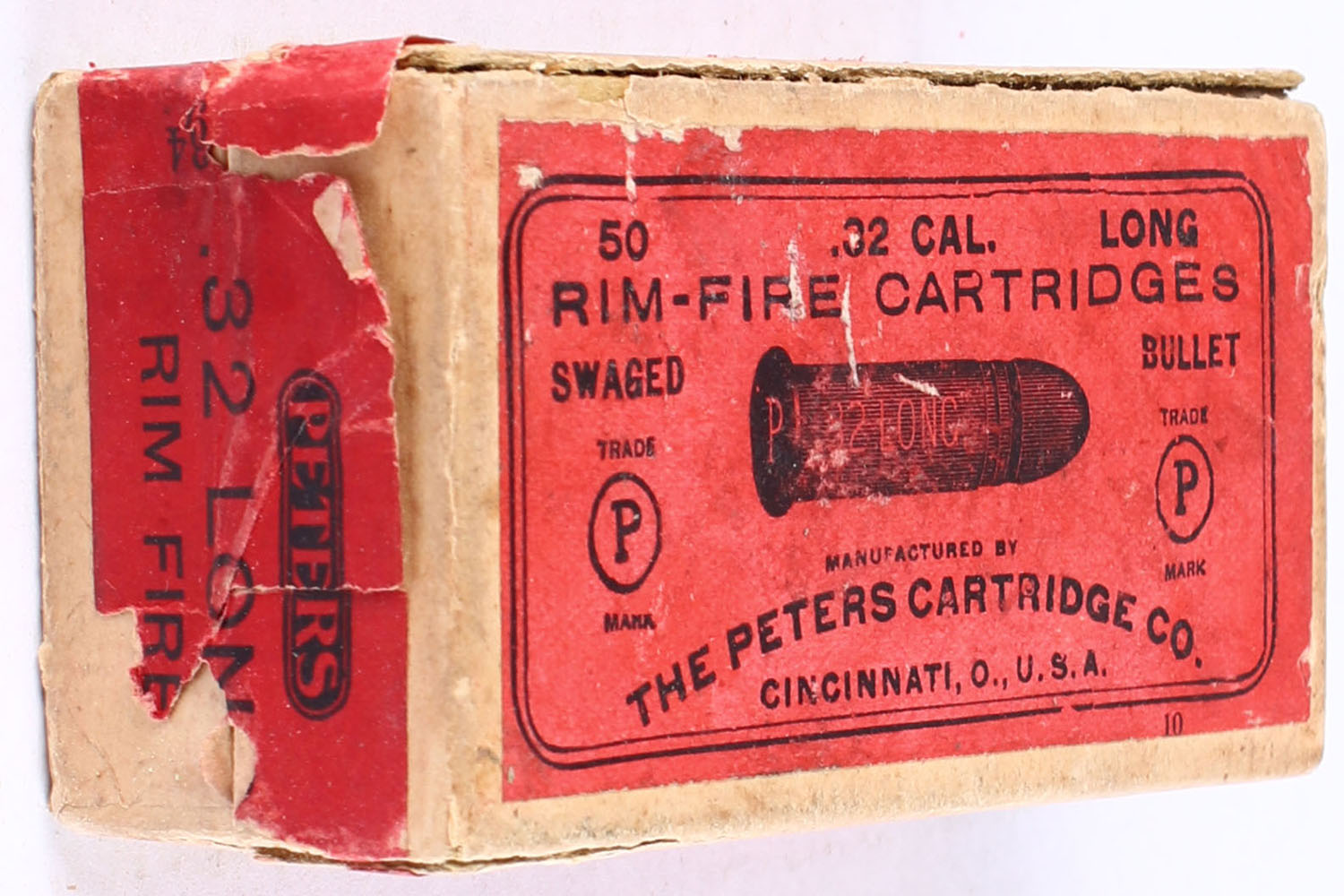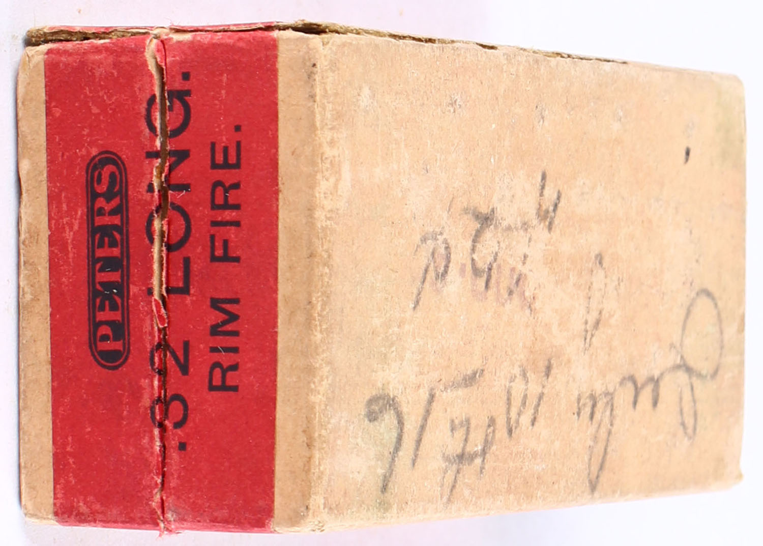Peters, Rim-Fire Cartridges, .32 Long Rim Fire, Swaged Bullet, Full, 2pc. Buff box with red top & side sealing labels, box has a torn but included side flap, has scuffing with edge wear, writing to bottom, ammo is poor . Grade: Good ++ - Value: 40 to 80