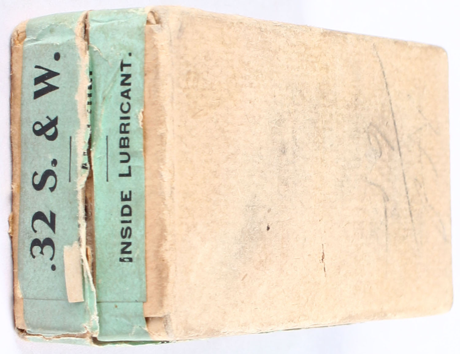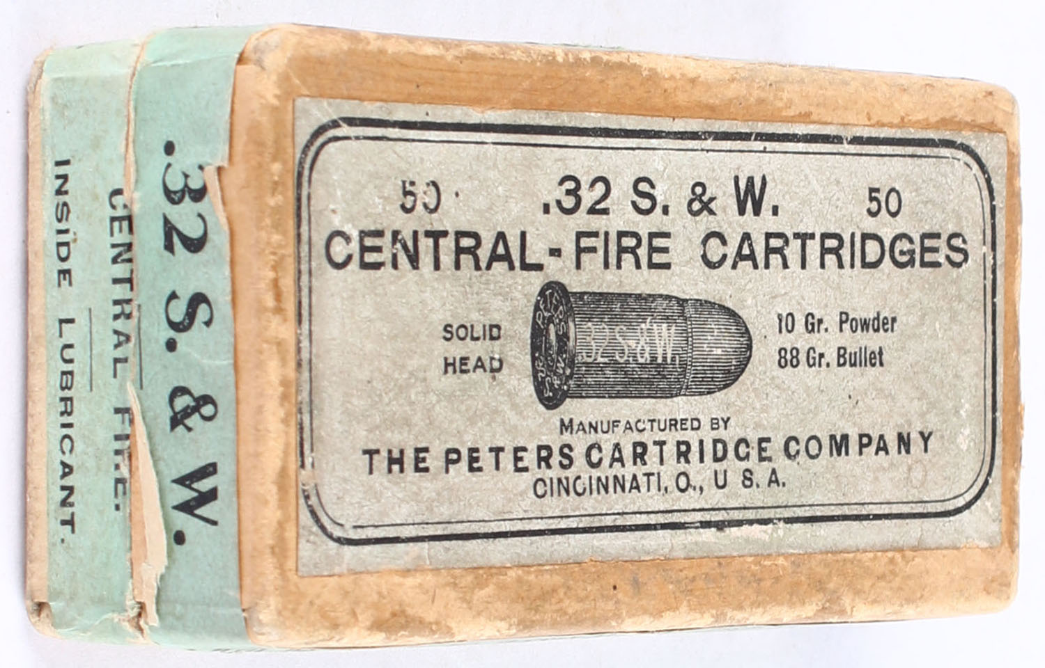 Peters, Central-Fire Cartridges, .32 Smith & Wesson, 88 Grain Solid Head Bullet, Full, 2pc. Buff box with green top & side sealing labels, box is solid with good color, some age soiling, some edge & corner wear, labels are intact, ammo is excellent. Grade: Very Good ++ - Value: 24 to 36