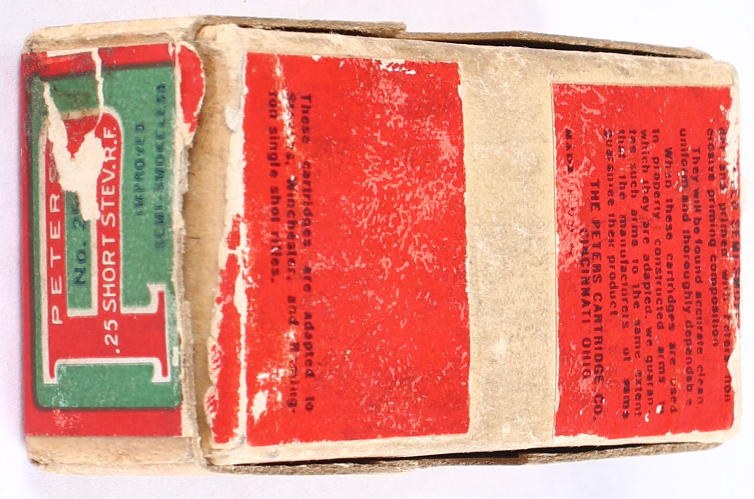 Peters, R.F. Cartridges, .25 Short Stevens Rim Fire, Improved Semi-Smokeless, Full, 2pc. Buff box with green red & blue labels, box is solid with very good to excellent color, minor age soiling & color fading, very minor corner wear, edges are crisp, labels are intact, ammo is excellent. Grade: Very Good ++ - Value: 50 to 200