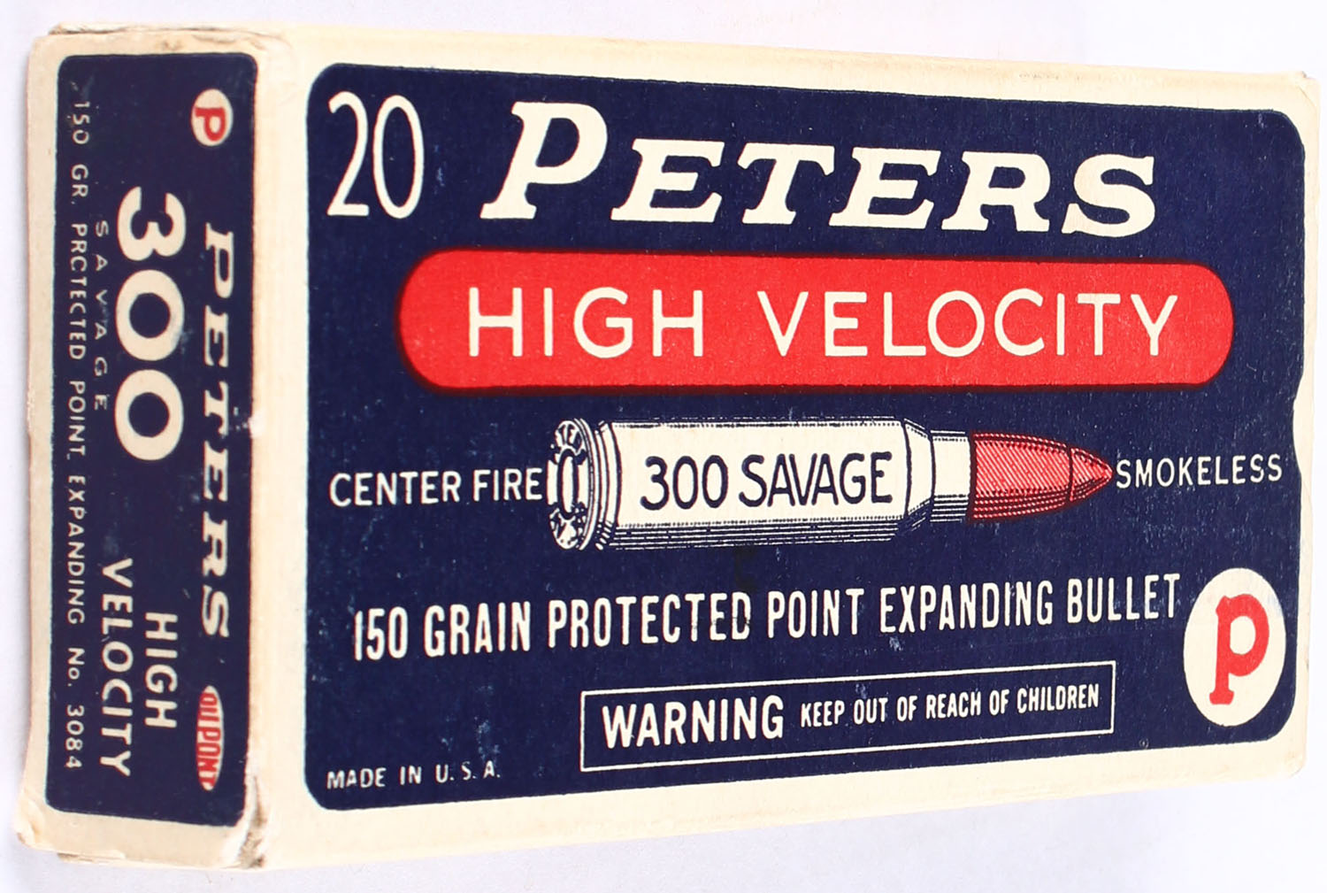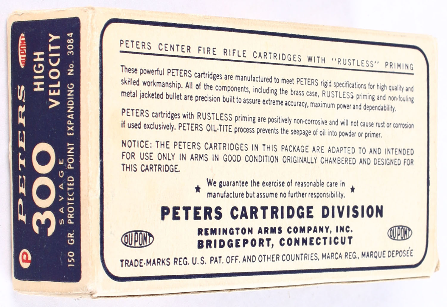 Peters, High Velocity, .300 Savage, 150 Grain Protected Point Expanding, Full, 1pc. White box with blue & red print, box is very solid with excellent color, edges are crisp, very minor corner wear, end flaps are solid, ammo is minty. Grade: Excellent + - Value: 120 to 180