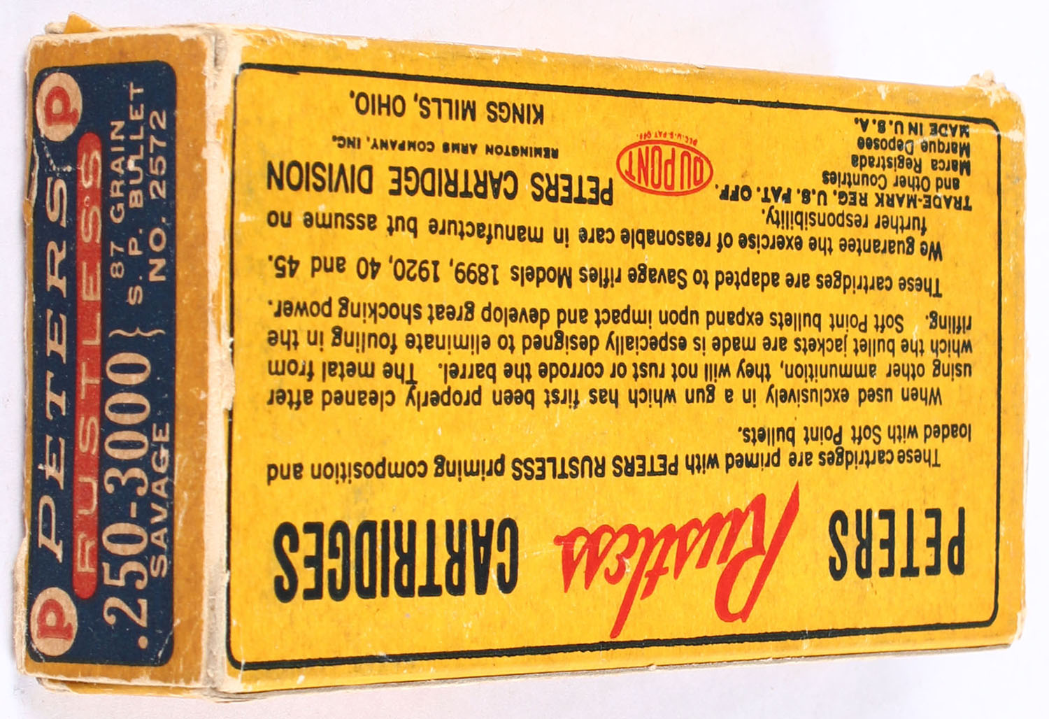 Peters, Rustless, .250-3000 Savage, 87 Grain S.P. Bullet, Full with 16rds being correct, 1pc. Blue & red box, box has shelf wear with edge wear, left end flap is partially torn, ammo is very good. Grade: Very Good - Value: 40 to 80