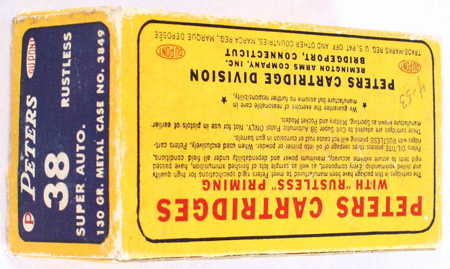 Peters, Rustless, .38 Super Auto., 130 Grain Metal Case Bullet, Full, 1pc. Blue yellow & red box, box is solid with excellent color, minor shelf wear, some corner wear, very minor edge wear, end flaps are solid, ammo is excellent. Grade: Excellent - Value: 30 to 60