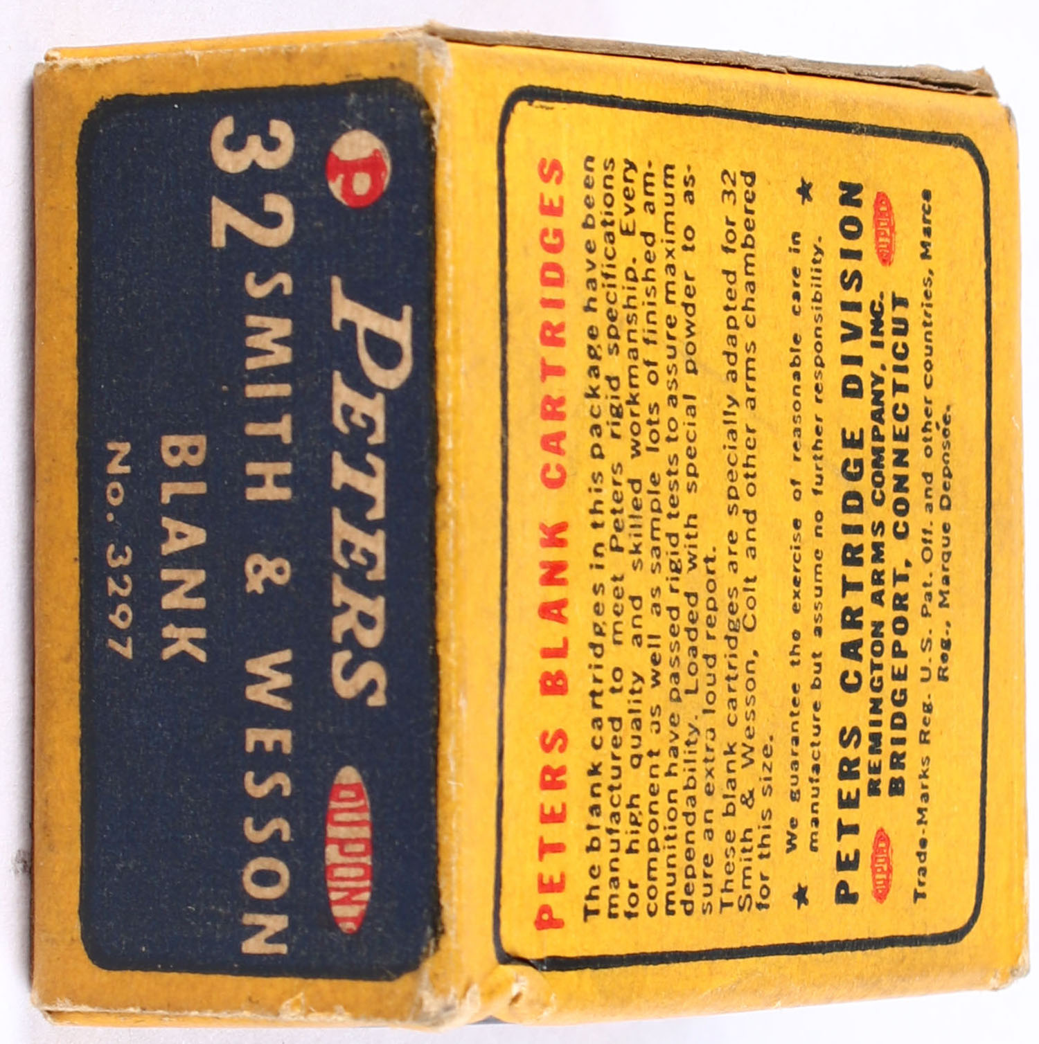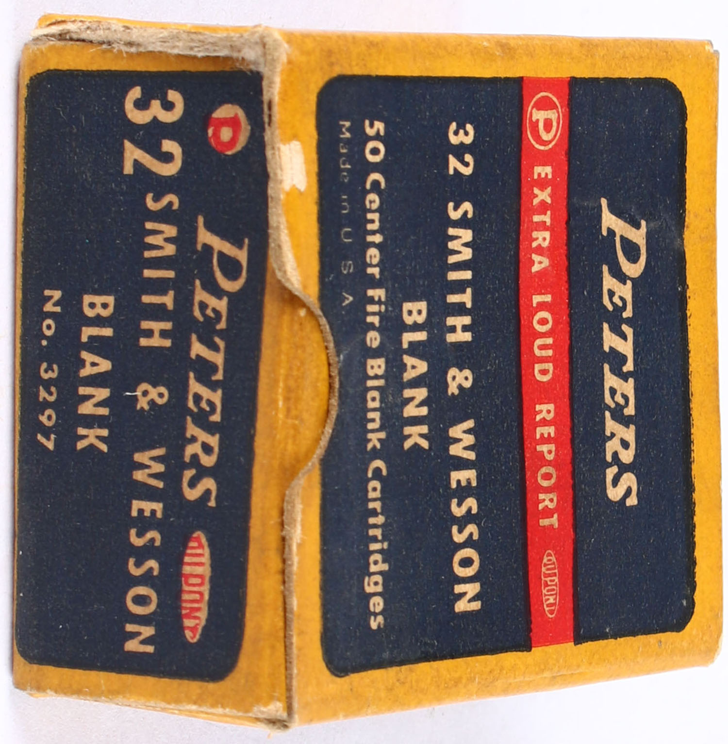 Peters, Extra Loud Report, .32 Smith & Wesson Blank, Partial 29rds., 1pc. Blue yellow & red box, box has shelf wear, end flaps are solid, ammo is excellent. Grade: Very Good ++ - Value: 16 to 30