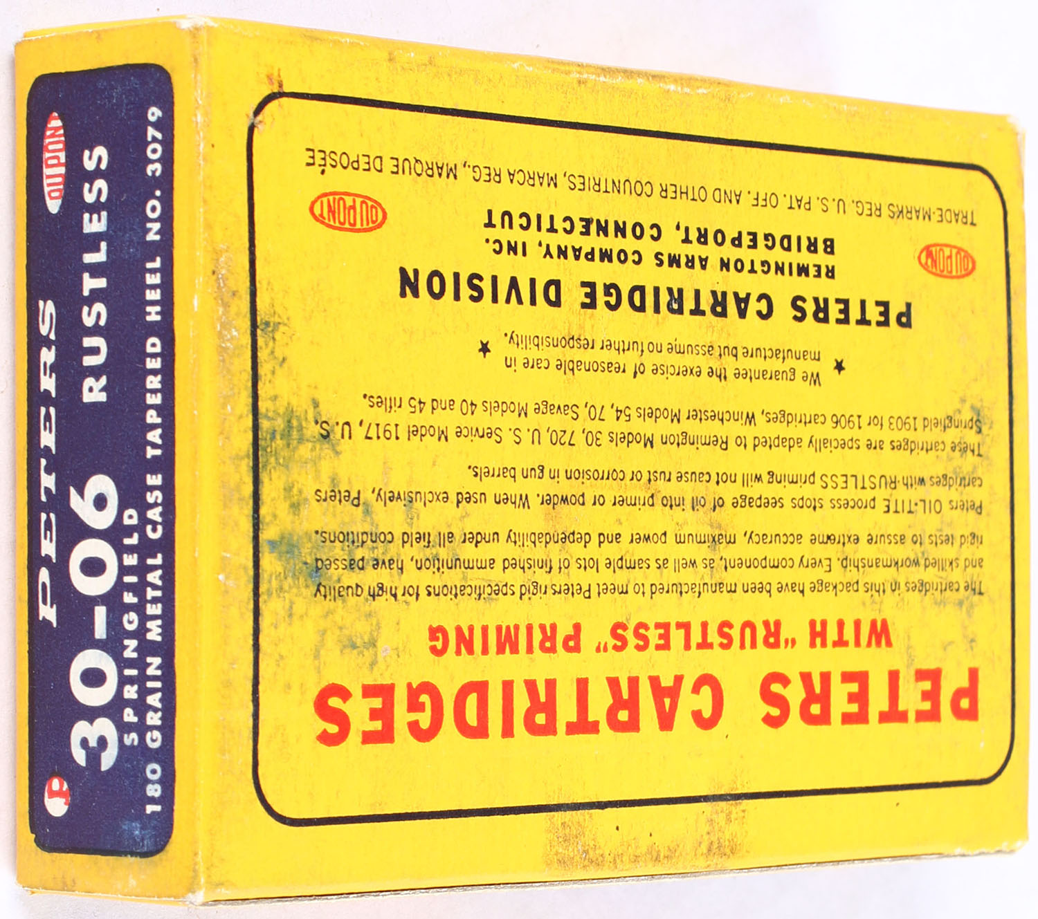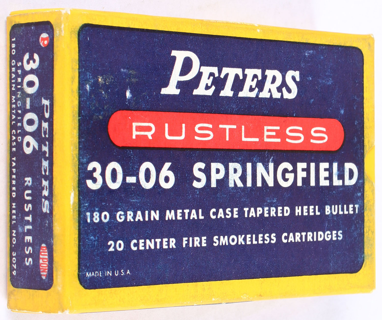 Peters, Rustless, .30-06 Springfield, 180 Grain Metal Case Tapered Heel Bullet, Full, 1pc. Blue yellow & red box, box is very solid with excellent color, has minor scuffing, corners are sharp, end flaps are solid, ammo is excellent. Grade: Excellent + - Value: 20 to 50