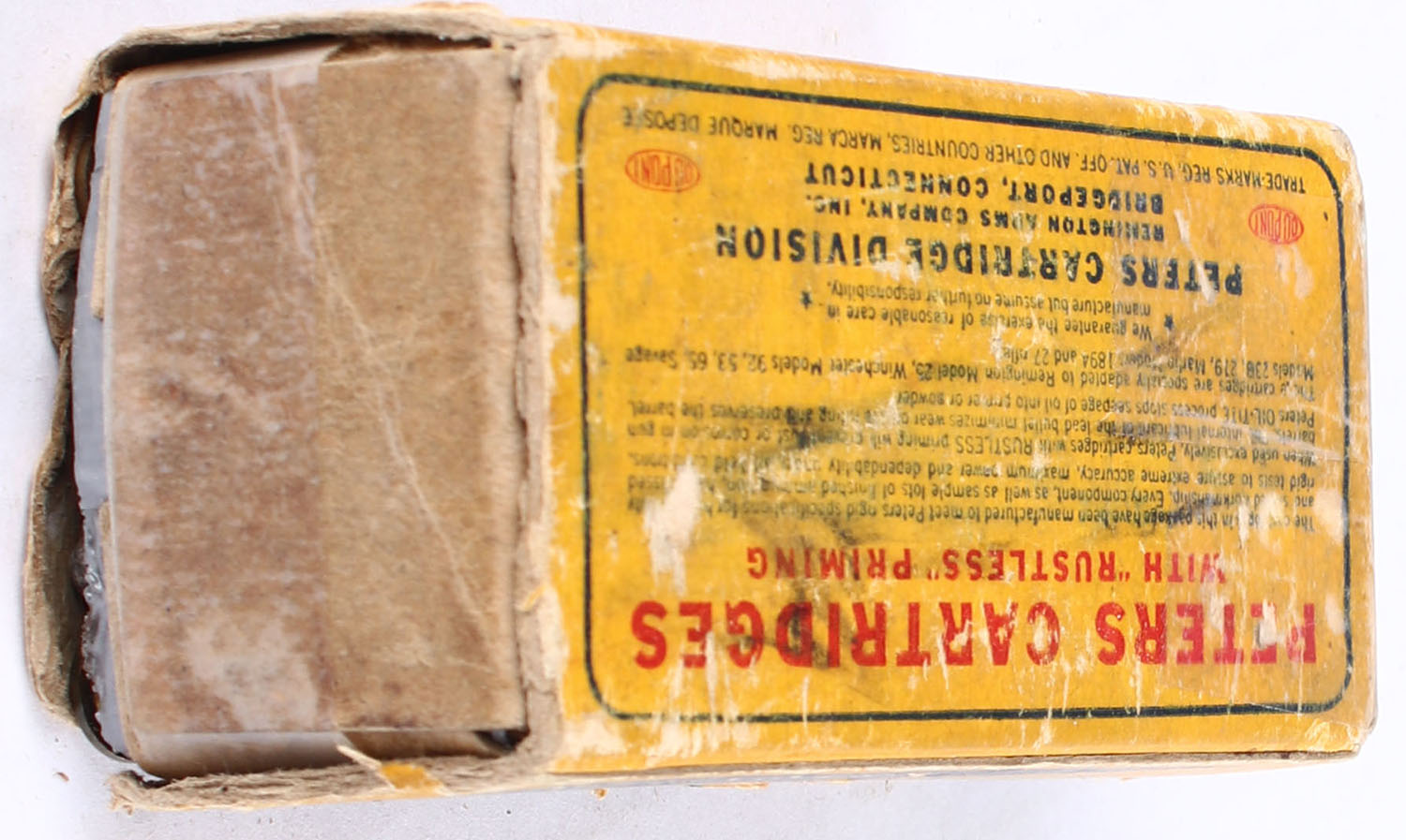 Peters, Rustless, .25-20 Winchester, 86 Grain Lead Bullet, Full, 1pc. Blue yellow & red box, box has seam splits with age soiling, has tape residue on box, missing right end flap, ammo is excellent. Grade: Excellent - Value: 80 to 120