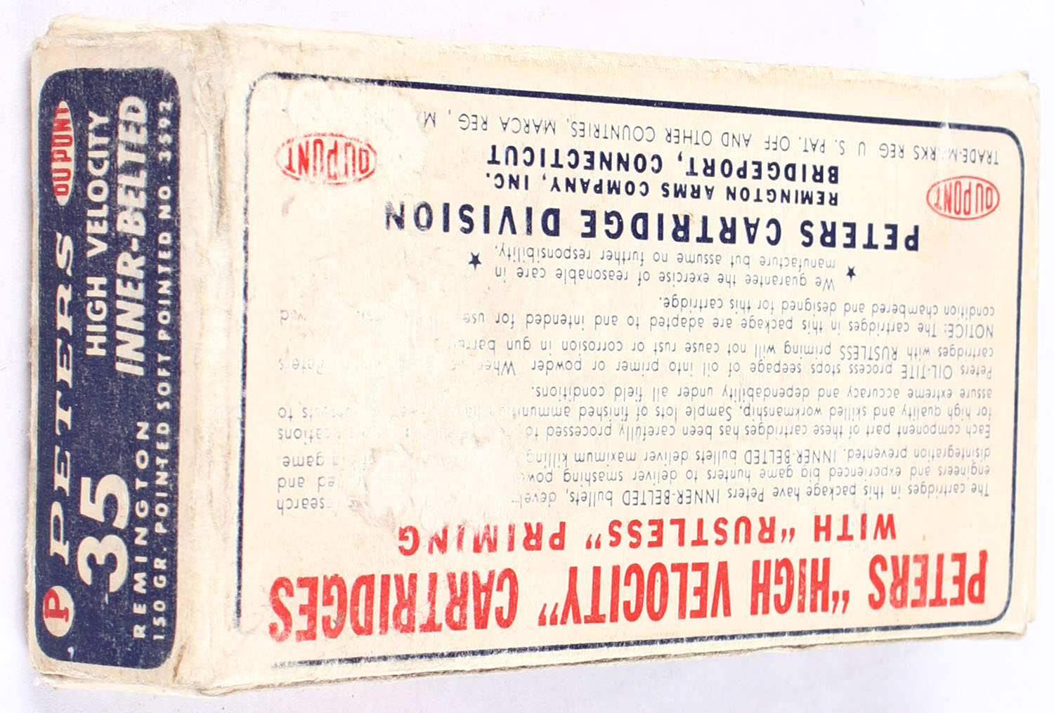 Peters, High Velocity, .35 Remington, 150 Grain Pointed Soft Point Inner-Belted Bullet, Full, 1pc. Blue white & red box, box is solid with great color, has shelf wear with edge & corner wear, end flaps are solid, ammo is very good. Grade: Very Good - Value: 30 to 45