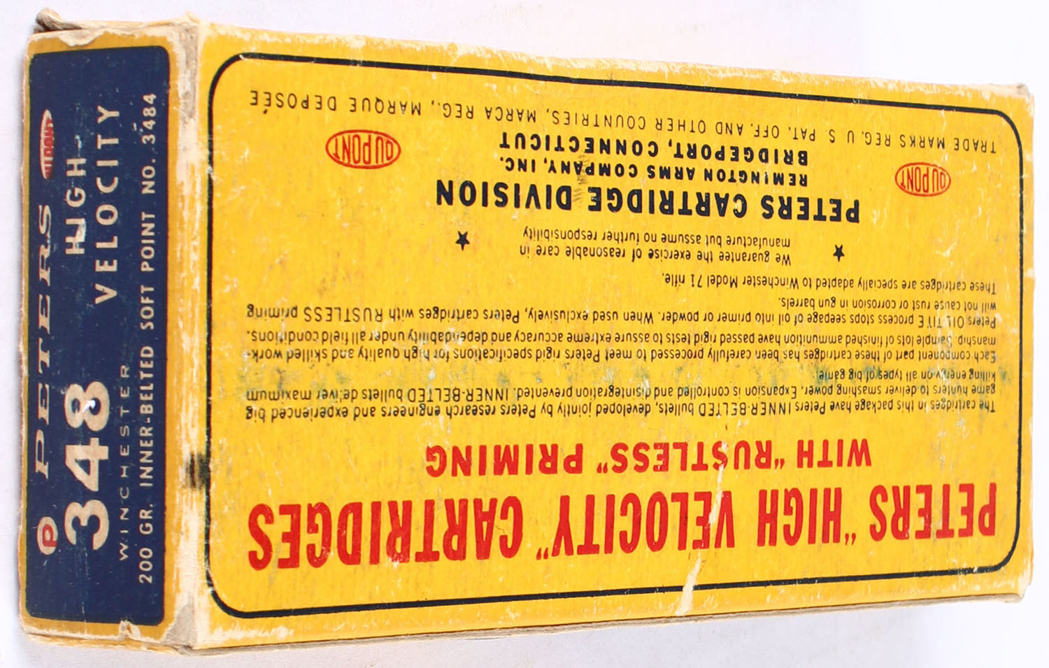 Peters, High Velocity, .348 Winchester, 200 Grain Inner-belted soft point bullet, Full, 1pc. Blue yellow & red box, box is solid with great color, box has scuffing with edge & corner wear, end flaps are solid, ammo is excellent. Grade: Very Good ++ - Value: 50 to 80