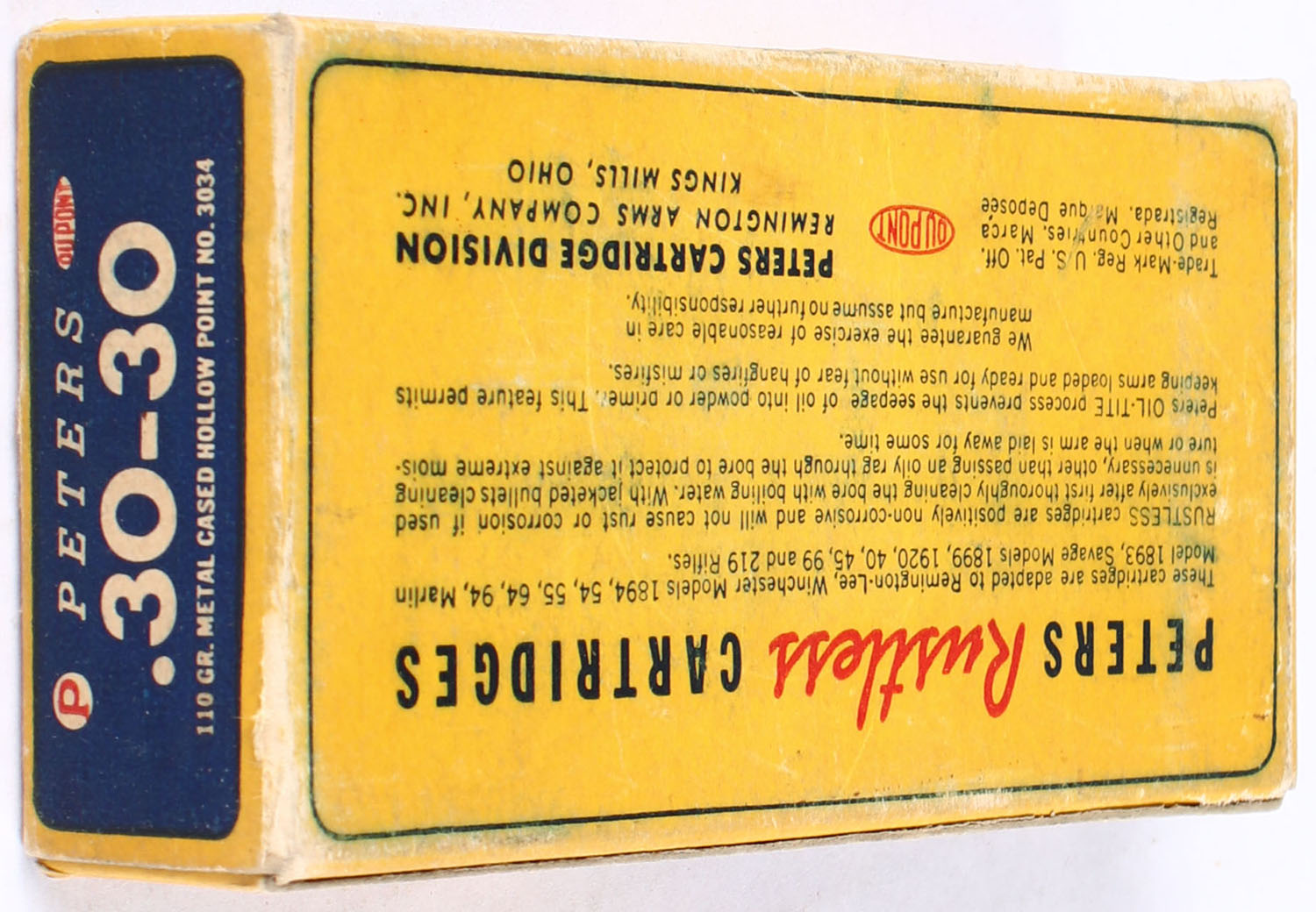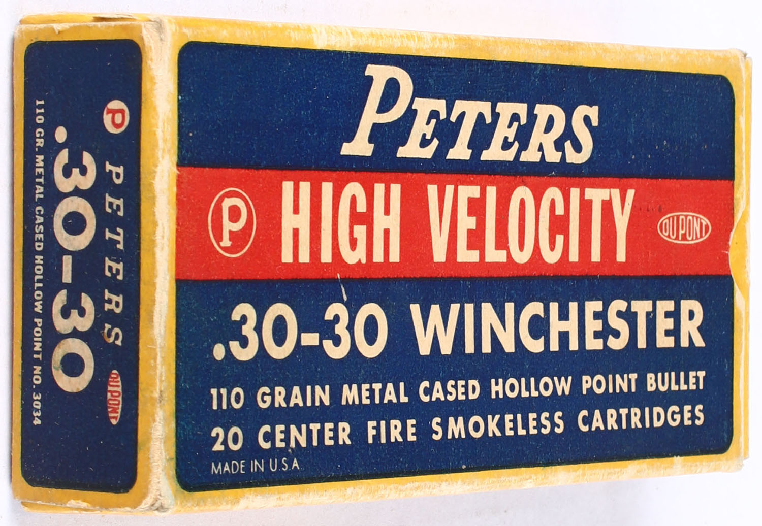 Peters, High Velocity, .30-30 Winchester, 110 Grain Metal Cased H.P Bullet, Full, 1pc. Blue yellow & red box, box is solid with excellent color, very minor shelf wear, very minor edge wear, end flaps are solid, ammo is excellent. Grade: Excellent - Value: 30 to 45