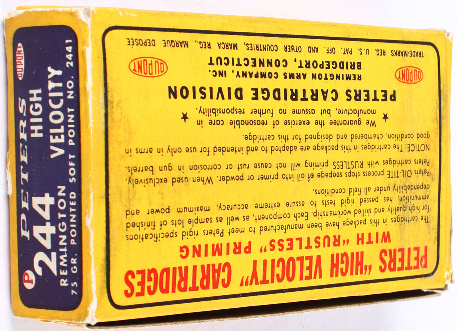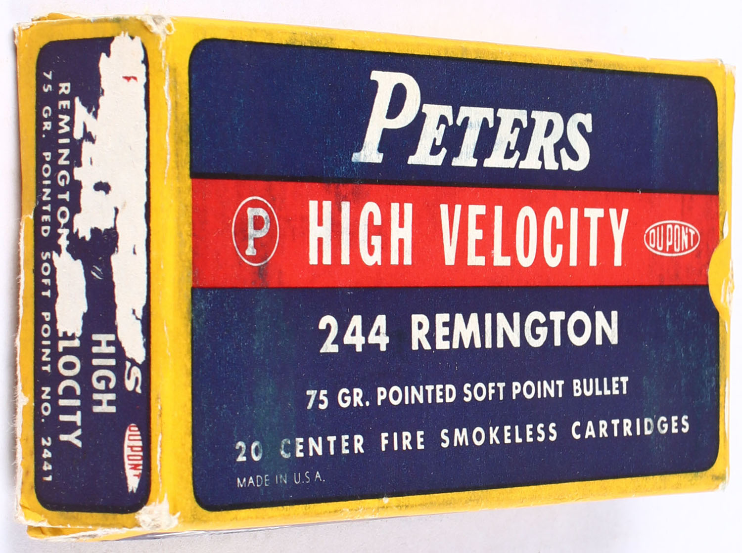 Peters, High Velocity, .244 Remington, 75 Grain Pointed Soft Point Bullet, Full, 1pc. Blue yellow & red box, box is solid with very good color, has some scuffing with minor corner wear and a seam split, edges are mostly crisp, left end flap has a partial seam split, ammo is excellent. Grade: Very Good - Value: 40 to 60