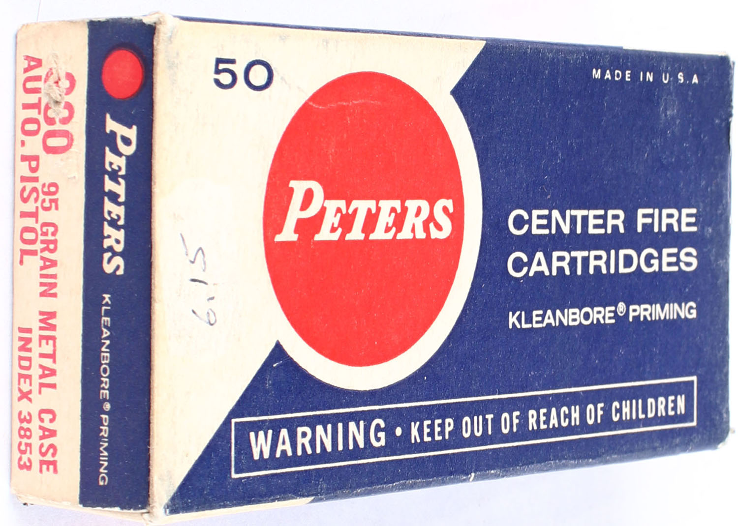 Peters, Center Fire Cartridges, .380 Automatic, 95 Grain Metal Case, Full, 1pc. Blue white & red box, box is solid with very good color, some age soiling & corner war, very minor edge wear, end flaps are solid, ammo is very good. Grade: Very Good ++ - Value: 20 to 30