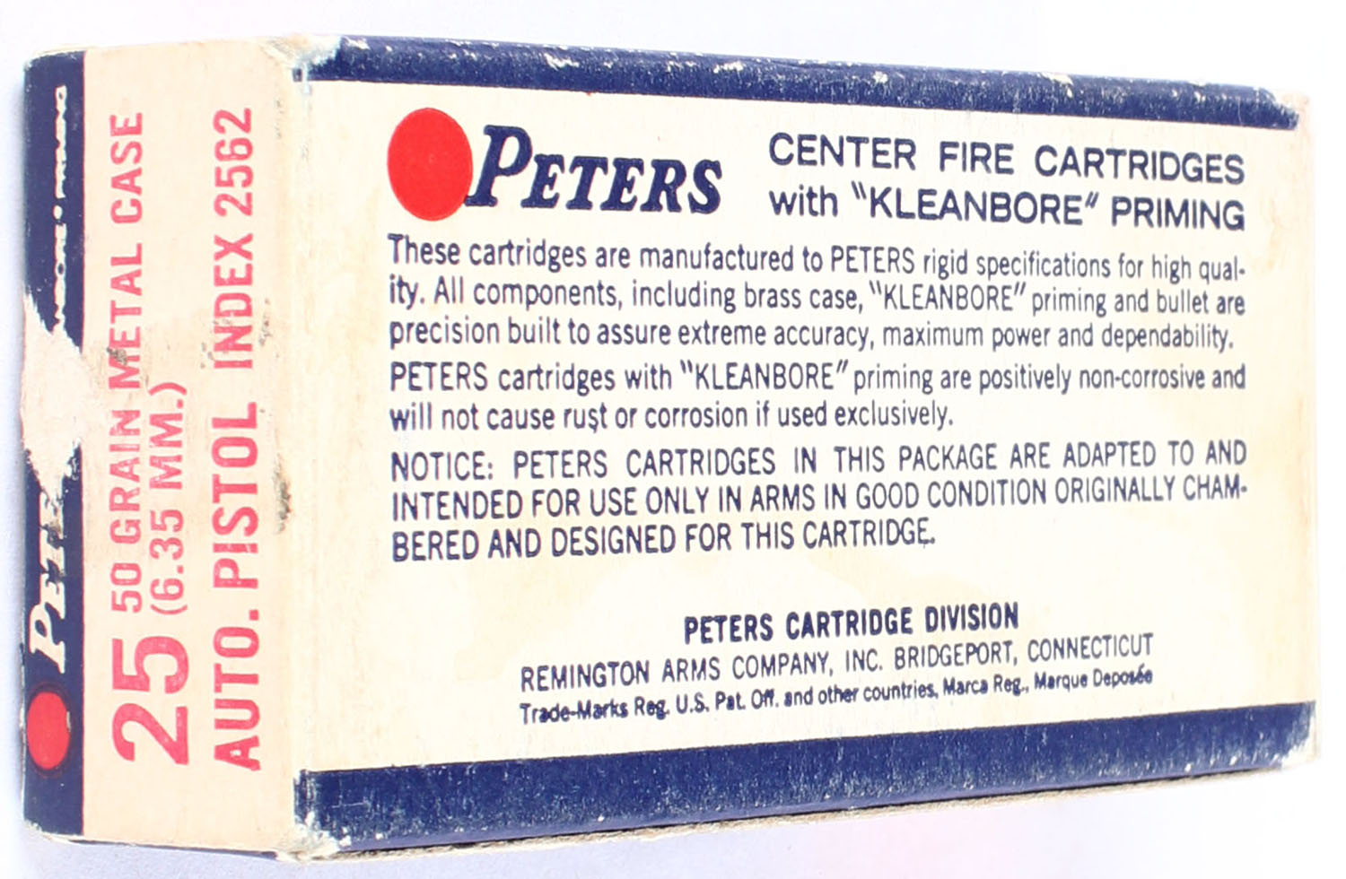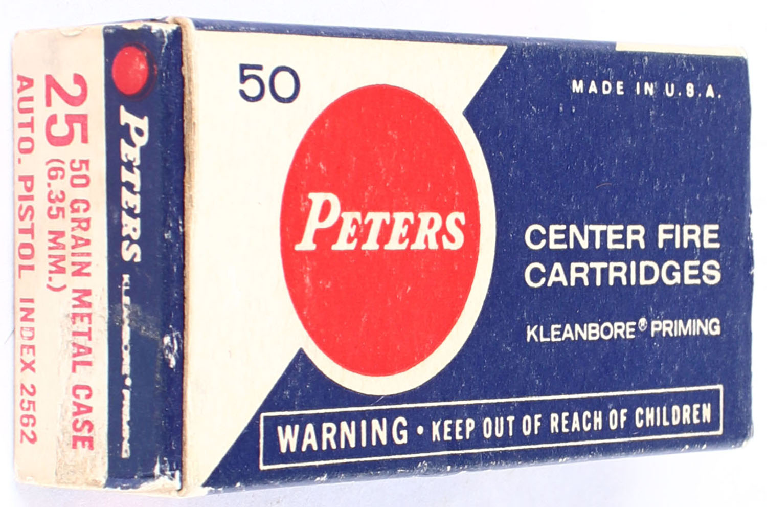 Peters, Center Fire Cartridges, .25 Automatic (6.35mm), 50 Grain Metal Case, Full, 1pc. Blue white & red box, box is solid with very good to excellent color, minor age soiling & shelf wear, edges are mostly crisp, end flaps are solid, ammo is excellent. Grade: Very Good ++ - Value: 24 to 36
