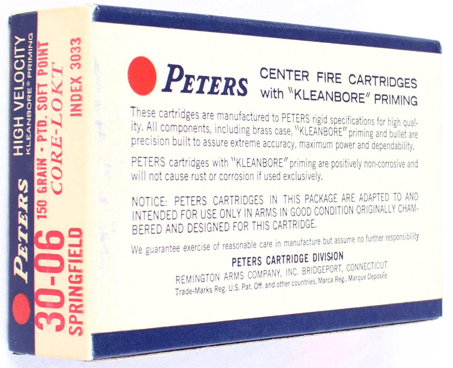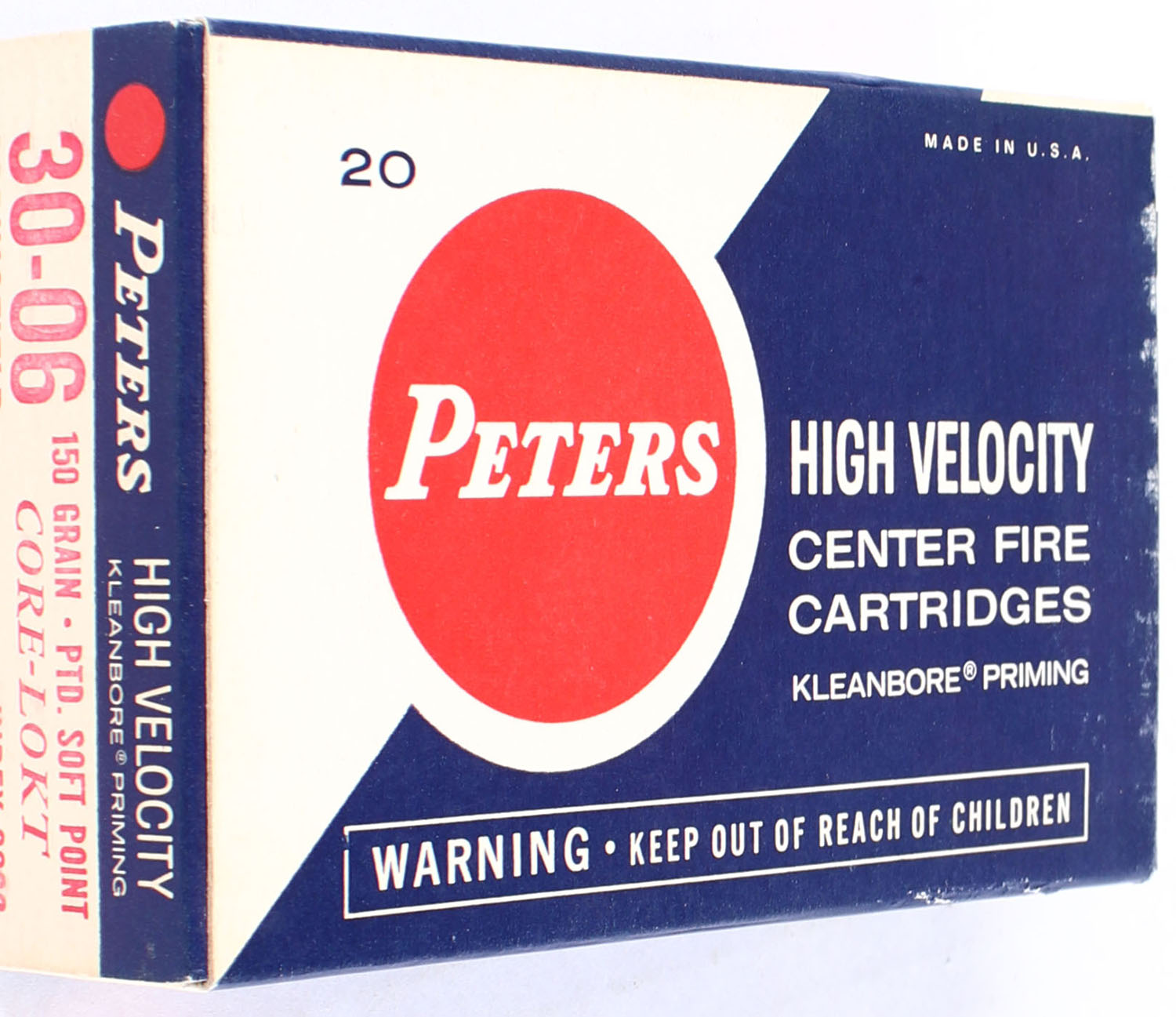 Peters, High Velocity, .30-06 Springfield, 150 Grain Pointed Soft Point Core-Lokt, Full, 1pc. Blue yellow & red box, box is solid with excellent color, minor shelf wear, very minor corner wear, edges are crisp, end flaps are solid, ammo is excellent. Grade: Excellent + - Value: 16 to 40