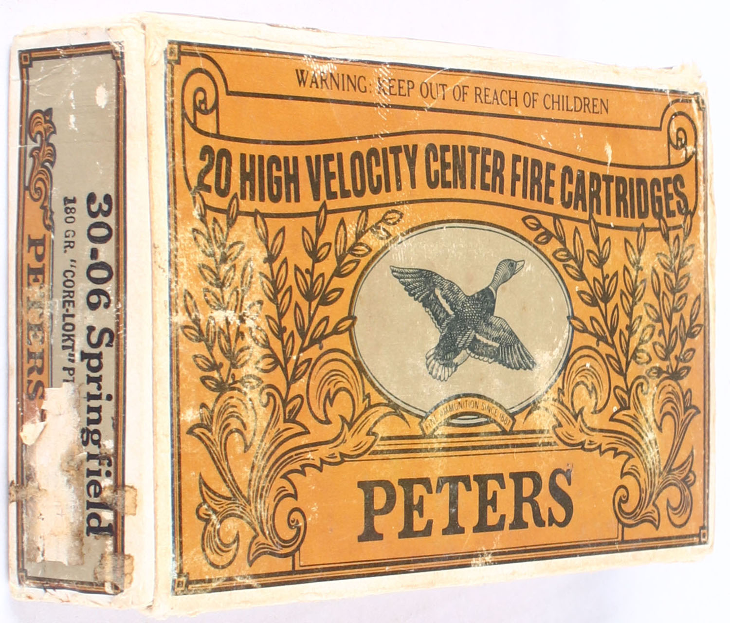 Peters, High Velocity Center Fire Cartridges, .30-06 Springfield, 180 Grain Core-Lokt Pointed Soft Point, Full, 1pc. Brown & black box, box has some age soiling with scuffing, edge & corner wear, end flaps are solid, ammo is very good. Grade: Good ++ - Value: 20 to 30