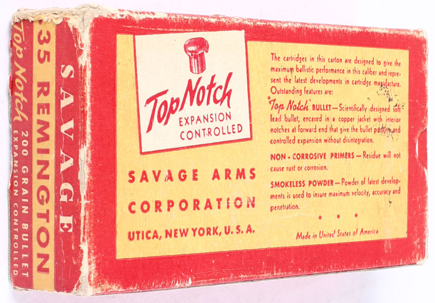 Savage, Hi-Power Cartridges, .35 Remington, 200 Grain Top Notch Expansion Controlled Bullets, Full, 1pc. Red & yellow box, box is solid with good color, has edge & corner wear with scuffing, end flaps are solid, ammo is excellent. Grade: Very Good ++ - Value: 80 to 150