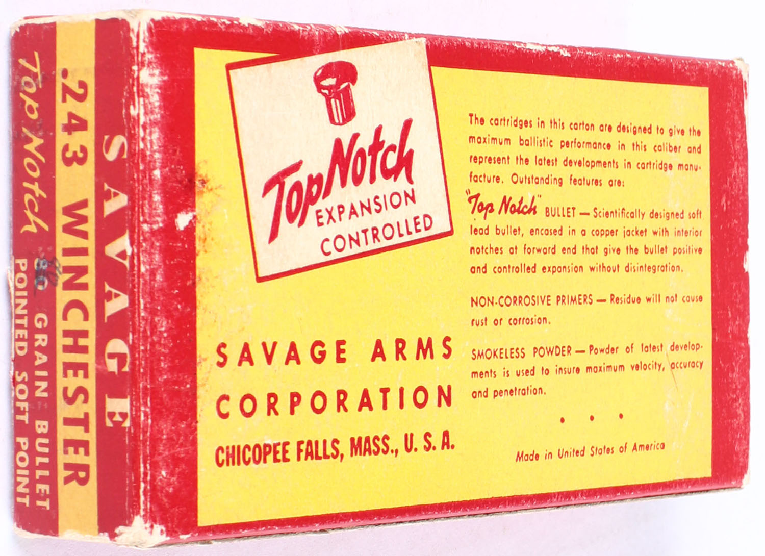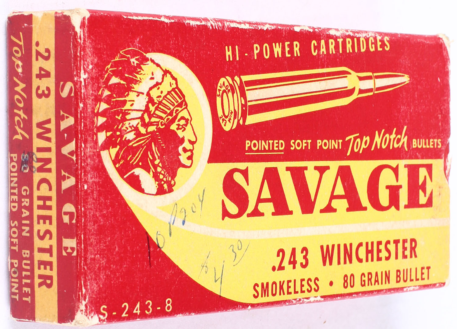 Savage, Hi-Power Cartridges, .243 Winchester, 80 Grain Pointed Soft Point Bullets, Full, 1pc. Red & yellow box, box is solid with excellent color, very minor age soiling & shelf wear, has corner and edge wear, end flaps are solid, ammo is excellent. Grade: Very Good ++ - Value: 50 to 150
