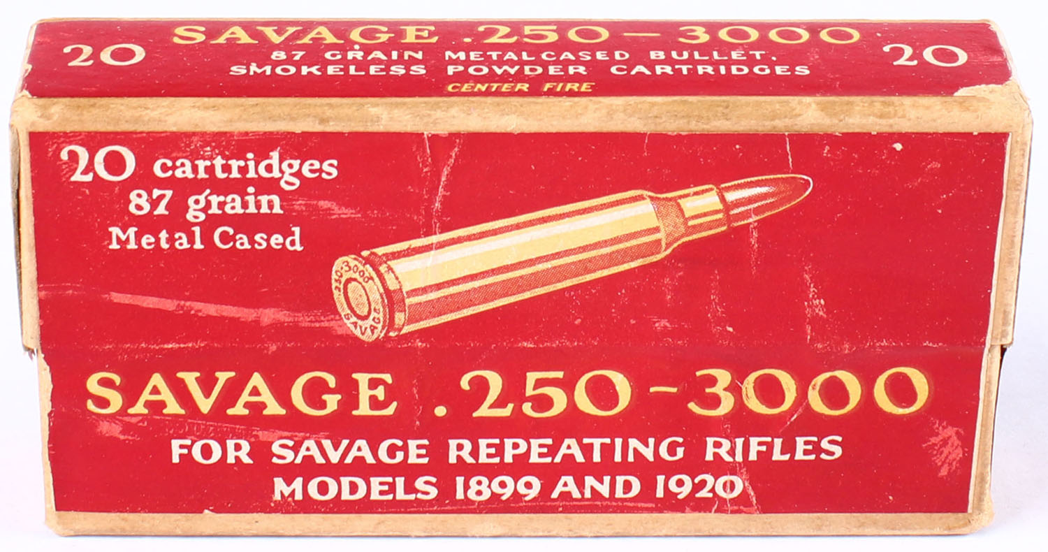 Savage, .250-3000 Savage, 87 Grain Metal Cased Bullet, Smokeless, FULL & SEALED, 2pc. Buff box with red & yellow label, box is very solid with excellent color, has rub marks with light corner wear, label in 90% intact. Grade: Excellent + - Value: 200 to 400