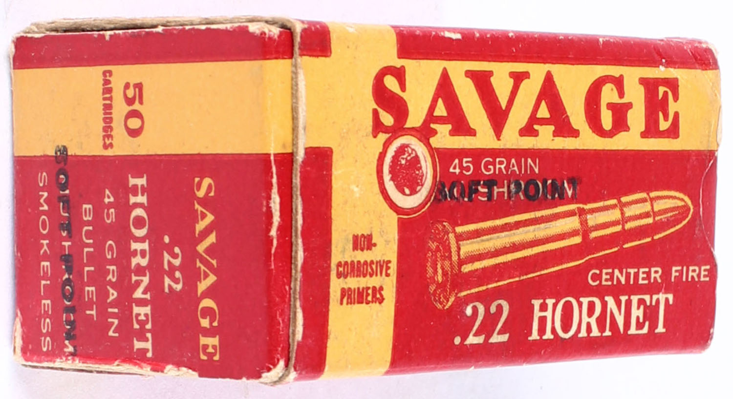 Savage, Center Fire, .22 Hornet, 45 Grain Soft Point, Full, 1pc. Red & yellow box, box is very solid with excellent color, light shelf wear with very minor corner wear, edges are crisp, end flaps are solid, ammo is excellent. Grade: Excellent - Value: 200 to 400
