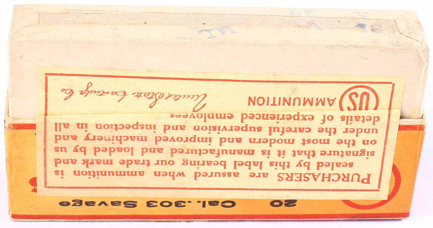 U.S., Smokeless Central Fire Cartridges, .303 Savage, FULL & SEALED, 2pc. Buff box with orange & red labels, box is solid with excellent color, very minor age soiling, corners are mostly sharp, edges are crisp, labels are intact. Grade: Excellent ++ - Value: 100 to 150