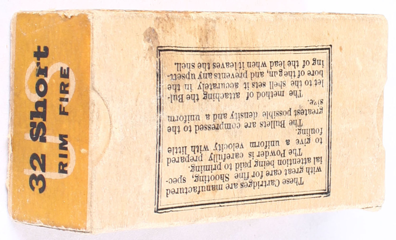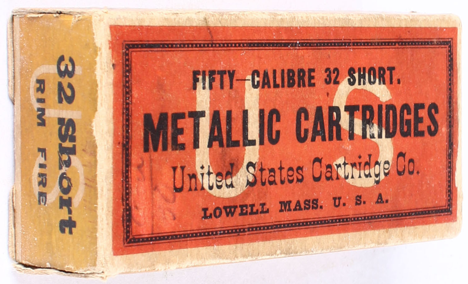 U.S., Metallic Cartridges, .32 Short Rim Fire, Target Cartridges, Full, 1pc. Buff & red box, box is very solid with great color, has shelf wear with minor corner & edge wear, end flaps are solid, ammo is fair. Grade: Very Good ++ - Value: 60 to 200