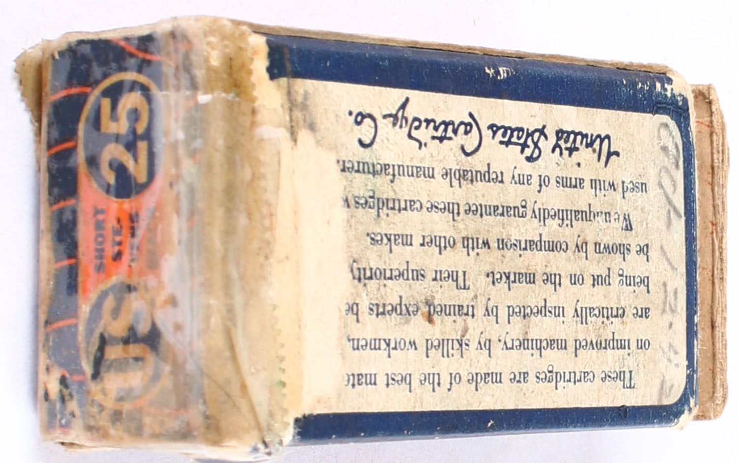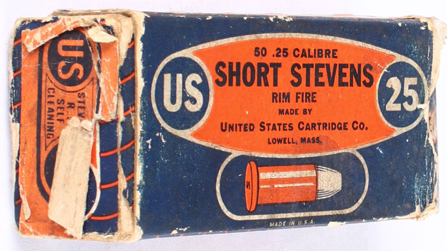 U.S., Rim Fire, .25 Short Stevens, Black Powder, Full, 1pc., Multi-colored box, box has torn end flaps, right flap has tape repair, has edge & corner wear with age soiling, ammo is excellent. Grade: Good + - Value: 40 to 80