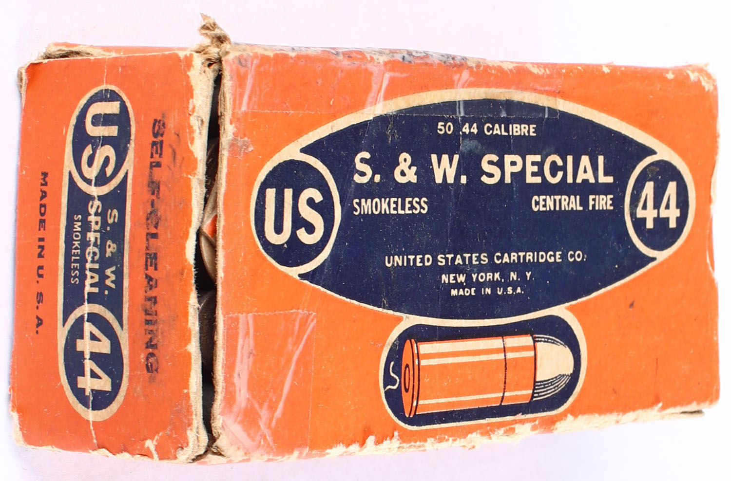 U.S., Central Fire Cartridges, .44 Smith & Wesson, Self Cleaning Smokeless, Full, 1pc. Orange & blue box, box has torn end flaps with age soiling, edge & corner wear, rub marks & tape repair to edge, ammo is very good. Grade: Good - Value: 20 to 60