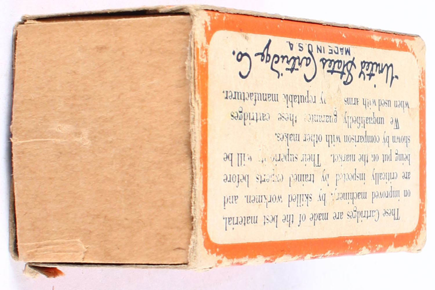U.S., Central Fire Cartridges, .32 Winchester, Self Cleaning Smokeless, Partial 38rds., 1pc. Orange & blue box, box has shelf wear with edge & corner wear, box is missing right end flap, ammo is very good. Grade: Good ++ - Value: 10 to 30