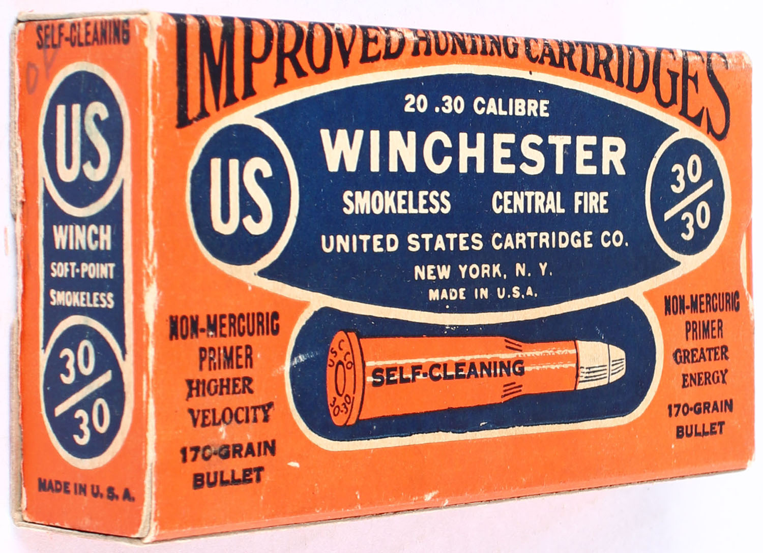 U.S., Smokeless Central Fire Cartridges, .30-30 Winchester, Full, 170 Grain, 1pc. Orange & blue box, box is very solid with excellent color, has light edge & corner wear, end flaps are solid, ammo is good to very good. Grade: Very Good ++ - Value: 20 to 60