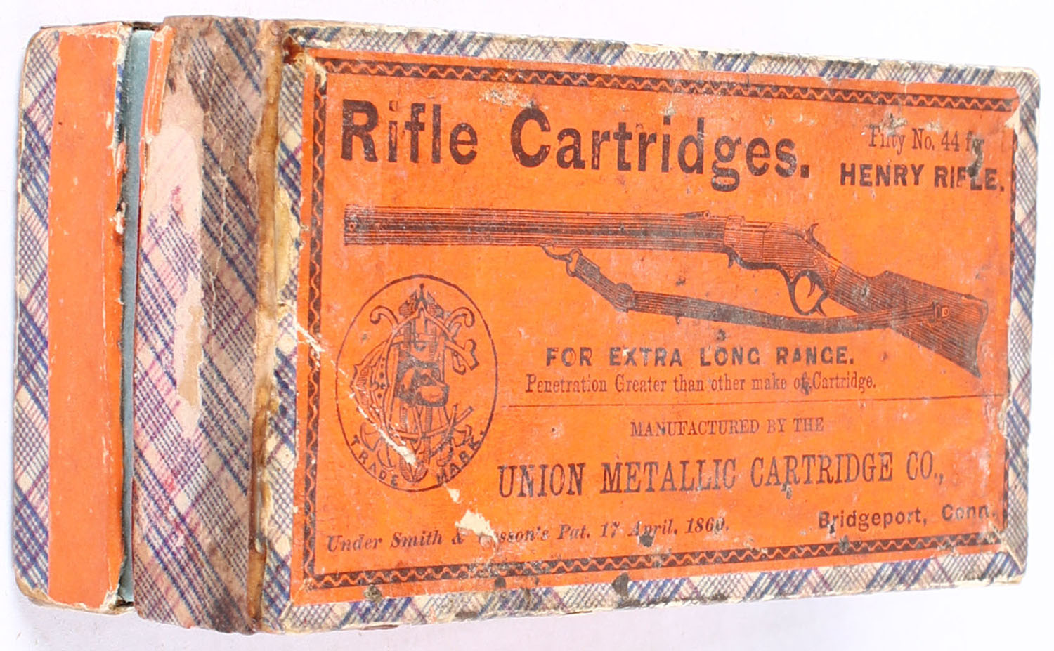 UMC, Rifle Cartridges, .44 Henry Rifle, Empty, 2pc. For extra long range, Purple fabric box with orange top & orange side sealing label, box is solid with good color, has age soiling with edge & corner wear, scuffing with writing to bottom. Grade: Good ++ - Value: 100 to 500
