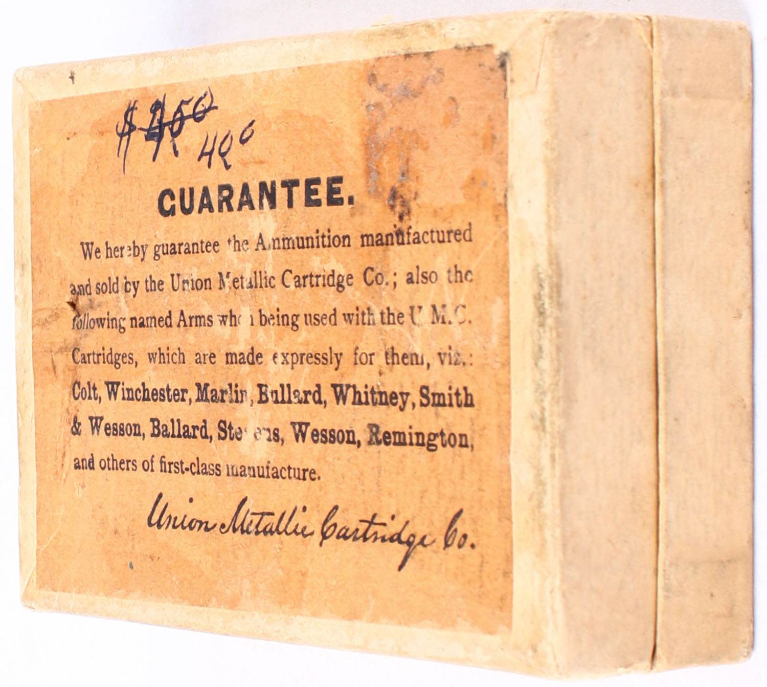 UMC, .40 Cal Straight Shell for Sharps Rifle, 90 grs. Powder, 370 gr. Patched Bullet, FULL & SEALED, 2pc. 2 5/8'' shell, 1 1/4'' patched bullet, Buff box with green label, box is solid with very good to excellent color, minor age soiling & shelf wear, has edge & corner wear, label is intact. Grade: Excellent - Value: 150 to 400