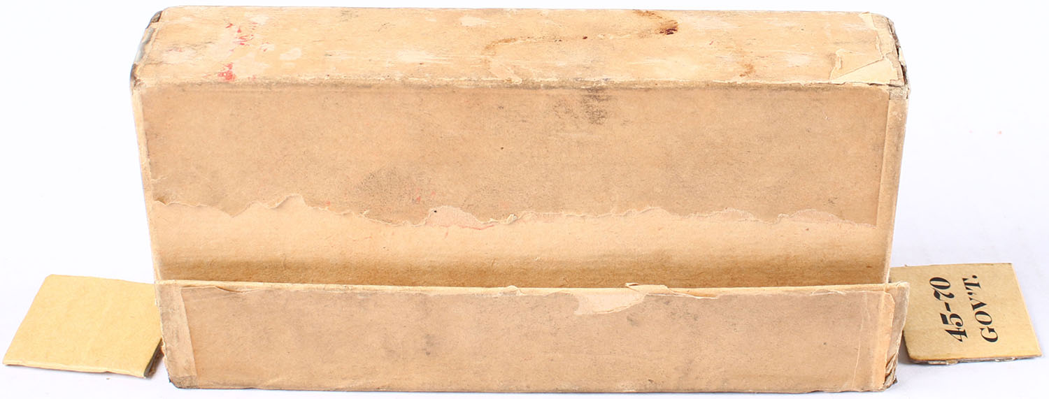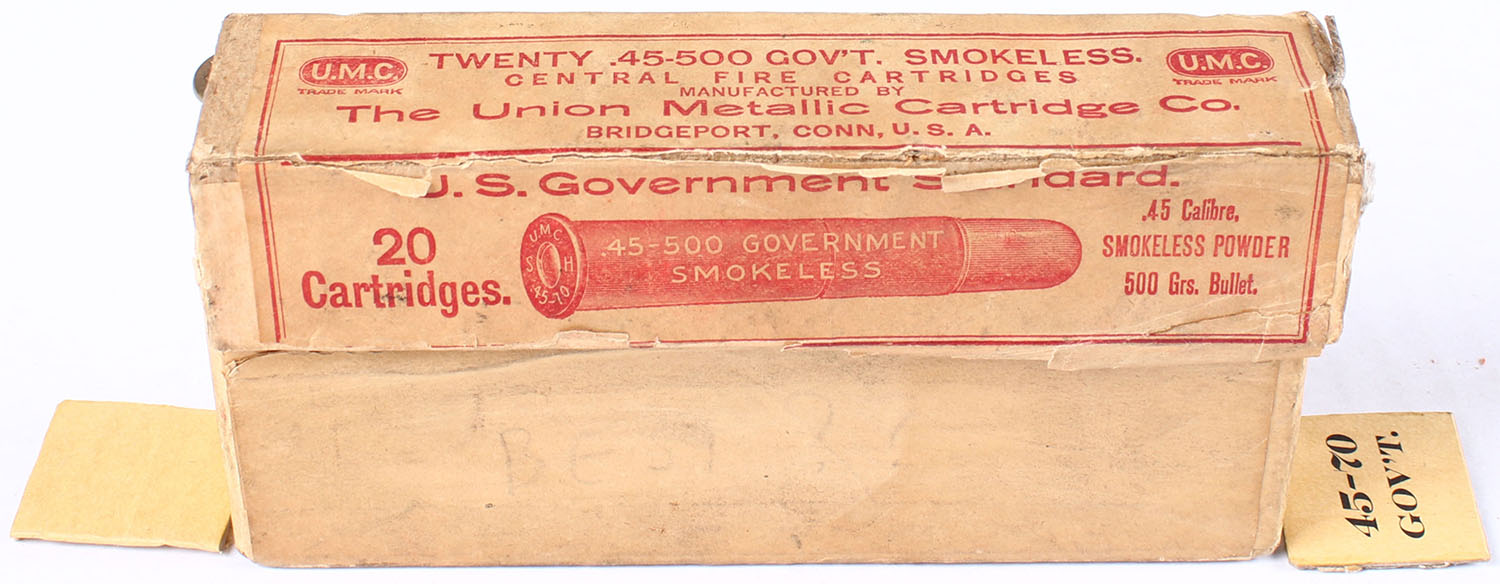 UMC, Central Fire Cartridges, .45-500 Government, 500 Grain Bullet, Full, 2pc. Buff box with red & buff label, buff box has age soiling, torn ends to lid, scuffing with edgewear, ammo is good. Grade: Very Good - Value: 30 to 60