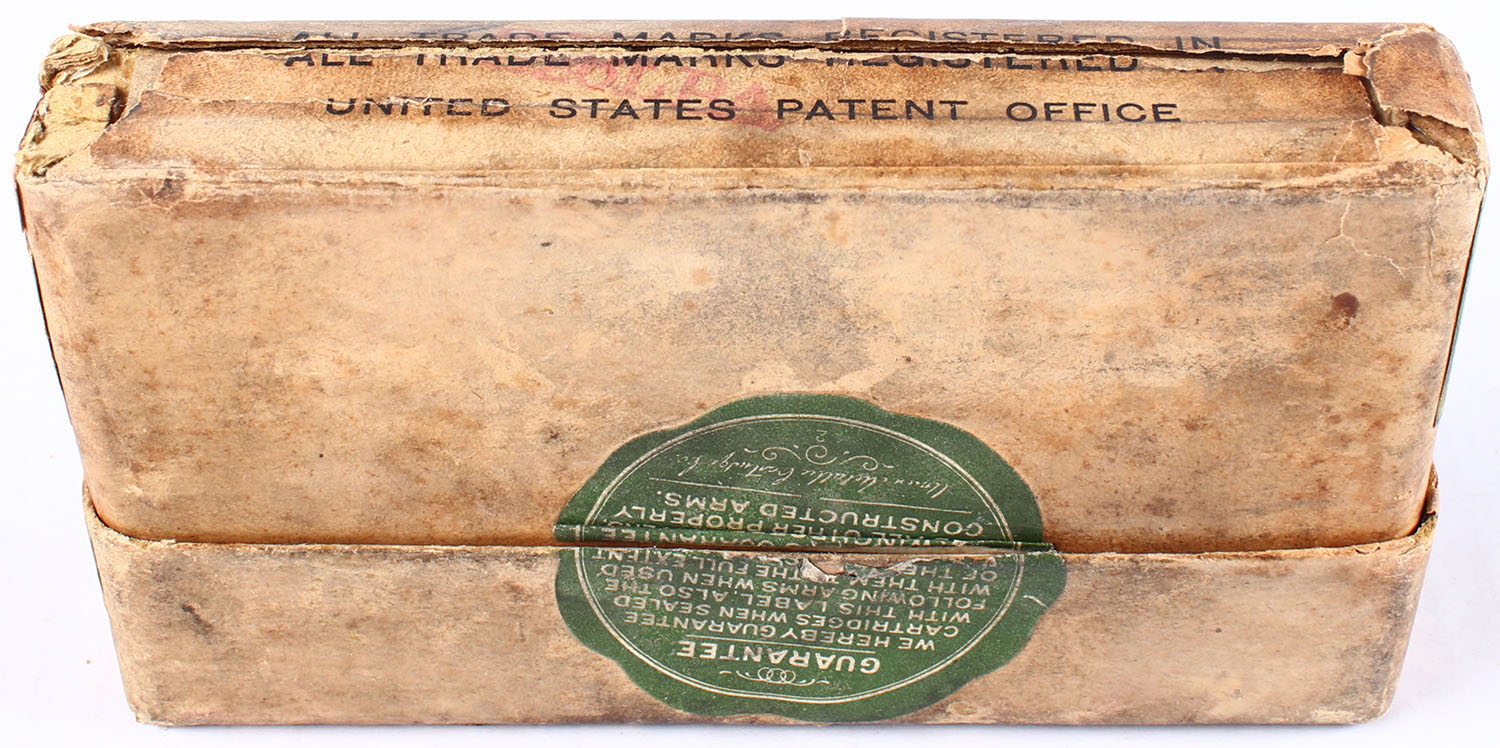 UMC, Central Fire Cartridges, .43 (11mm) Mauser, 77 Grain Powder, 380 Grain Bullet, has Overstamp ''Loaded with shot'', Full with paper sabot shot, 2pc. Buff box with green label, box has age soiling with fair color, edge & corner wear, partial seam split to bottom, ammo is good. Grade: Good + - Value: 30 to 60