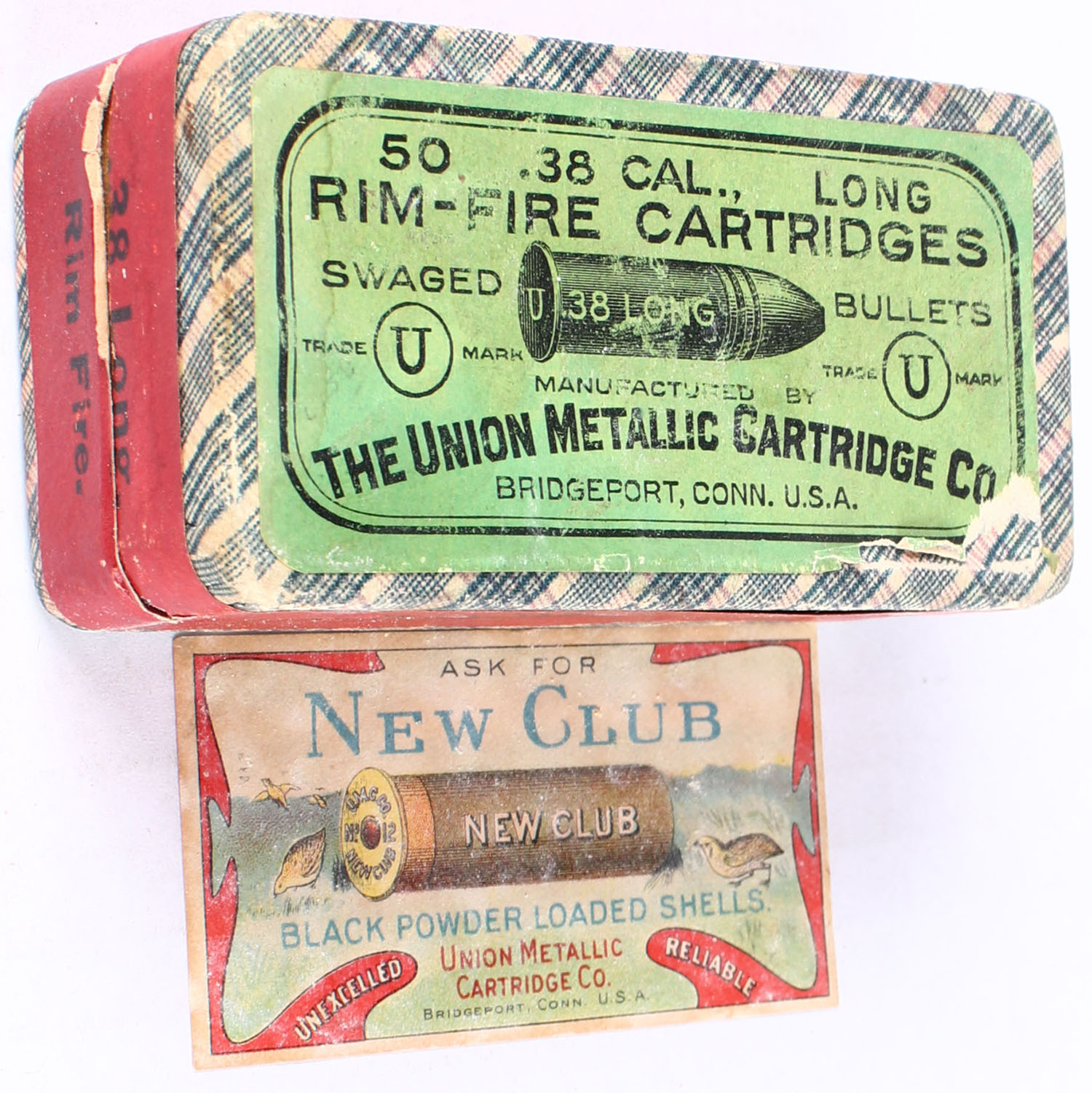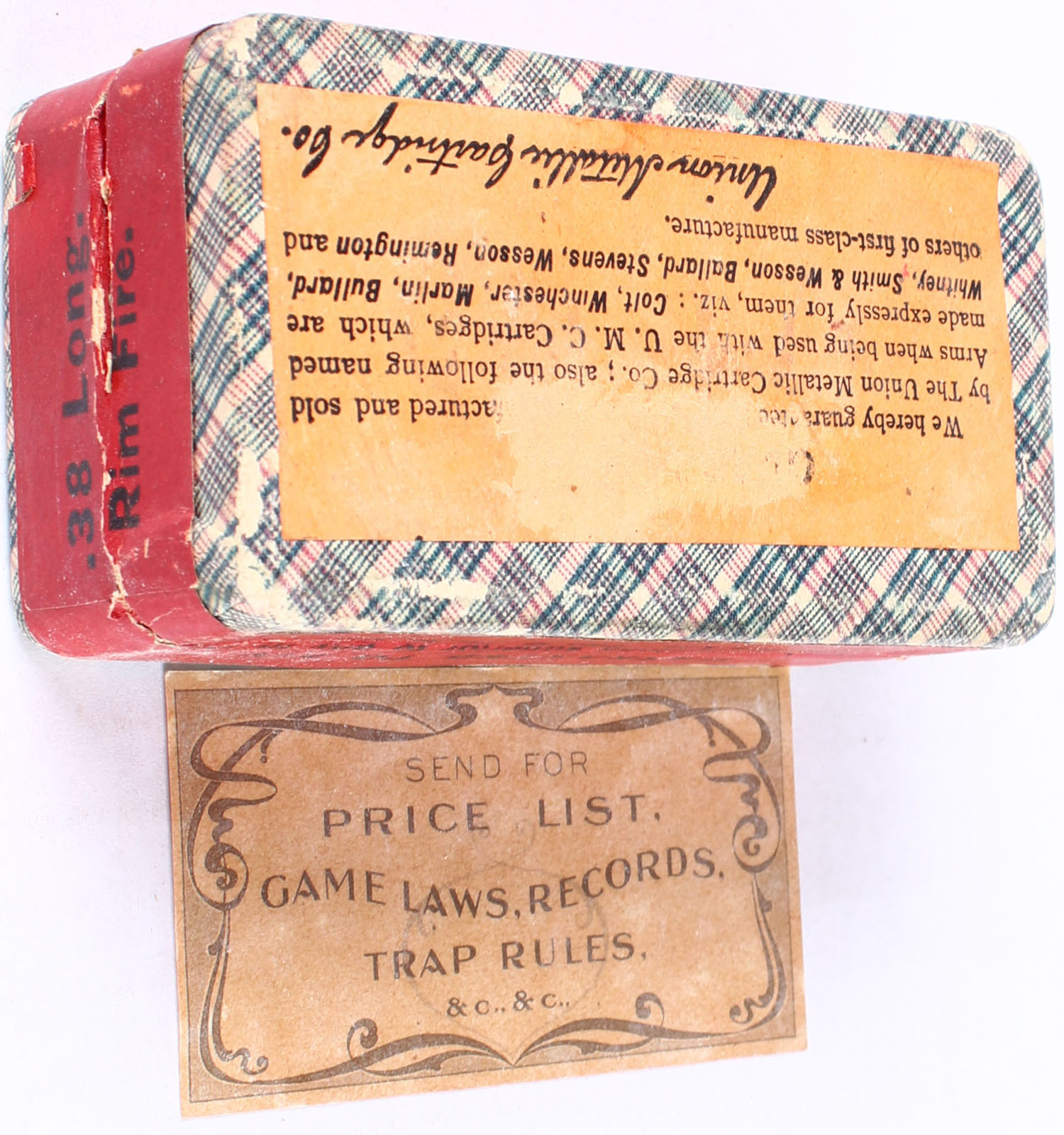 UMC, Rim Cartridges, .38 Long Cal., Full, Partially sealed, HAS INSERT, 2pc. plaid box with green top & red side labels, box is solid, ammo is very good. Grade: Excellent - Value: 50 to 100