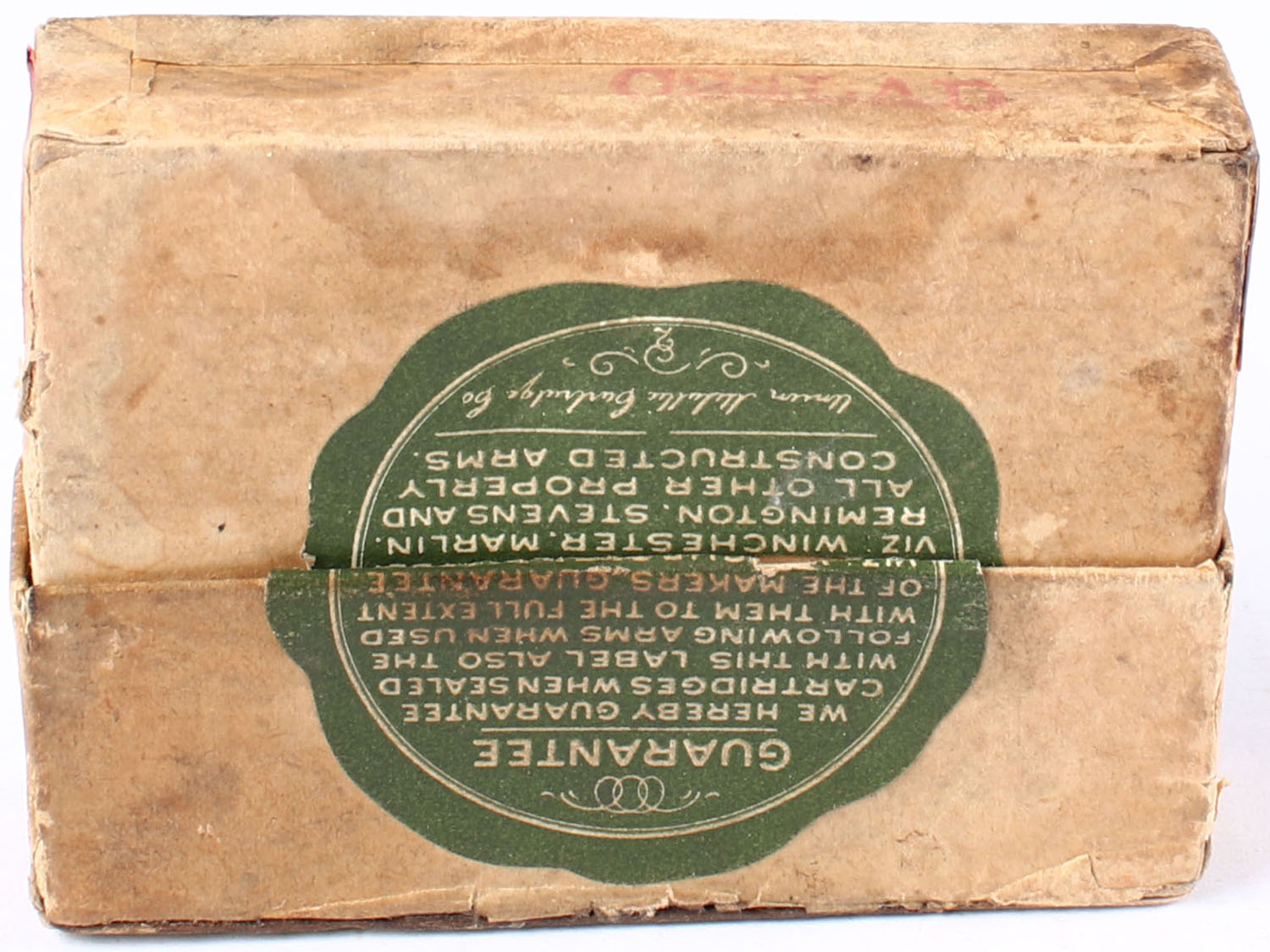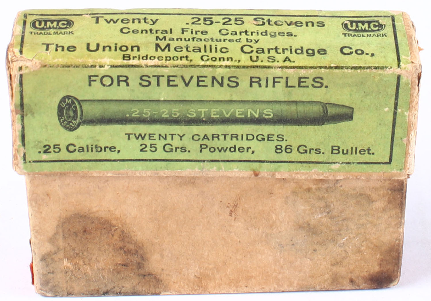 UMC, Center-Fire Cartridges, .25-25 Cal., Empty, 2pc. tan box with green top & side labels, box is solid with some scuffing. Grade: Very Good ++ - Value: 30 to 90