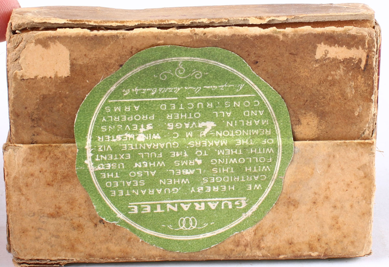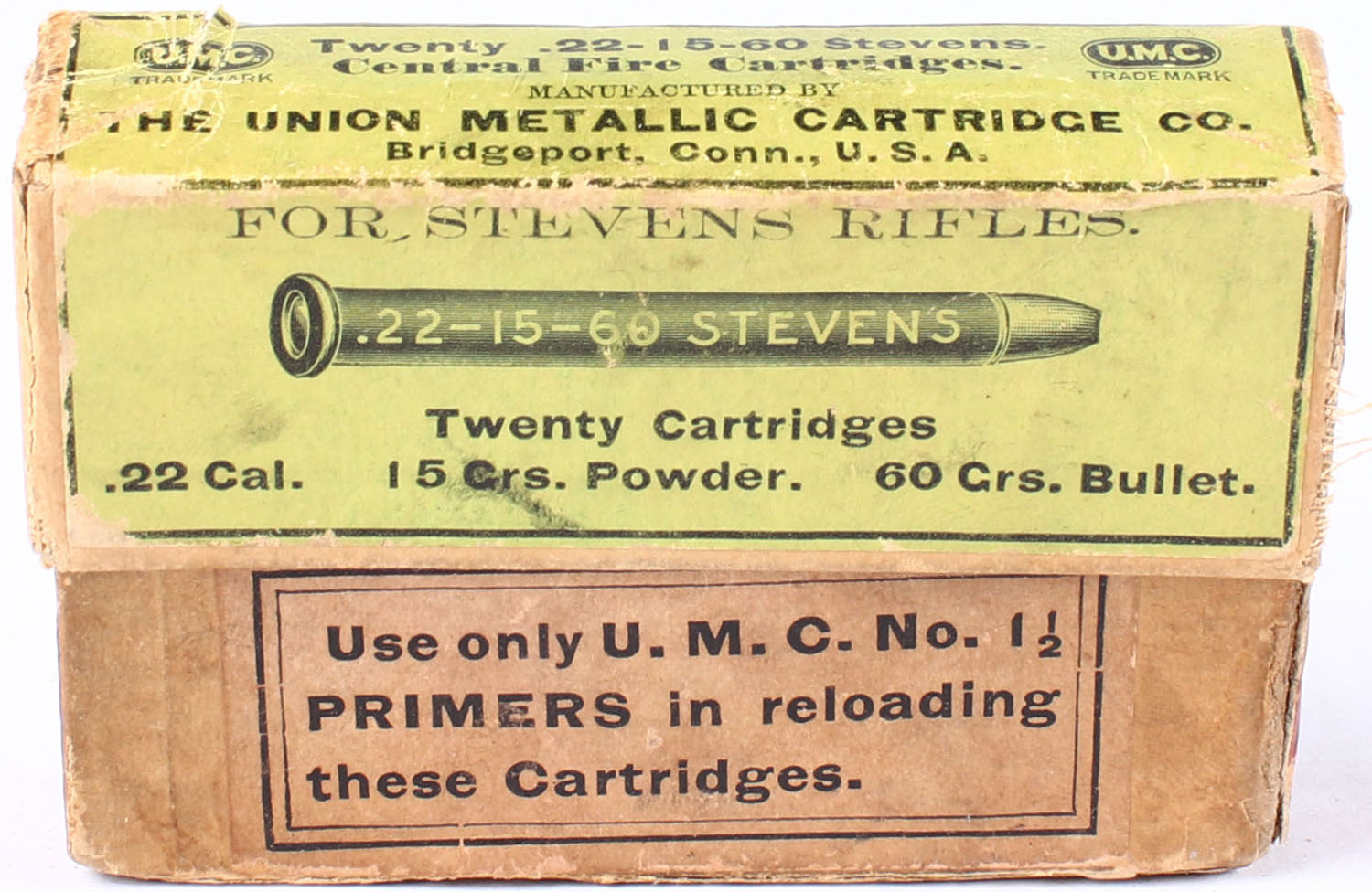 UMC, Central Fire Cartridges, .22-15-60 Stevens, 60 Grain Bullet, FULL & SEALED, 2pc. Buff box with green label, box has scuffing with edge & corner wear, has a seam split to bottom, label is intact. Grade: Good ++ - Value: 50 to 100