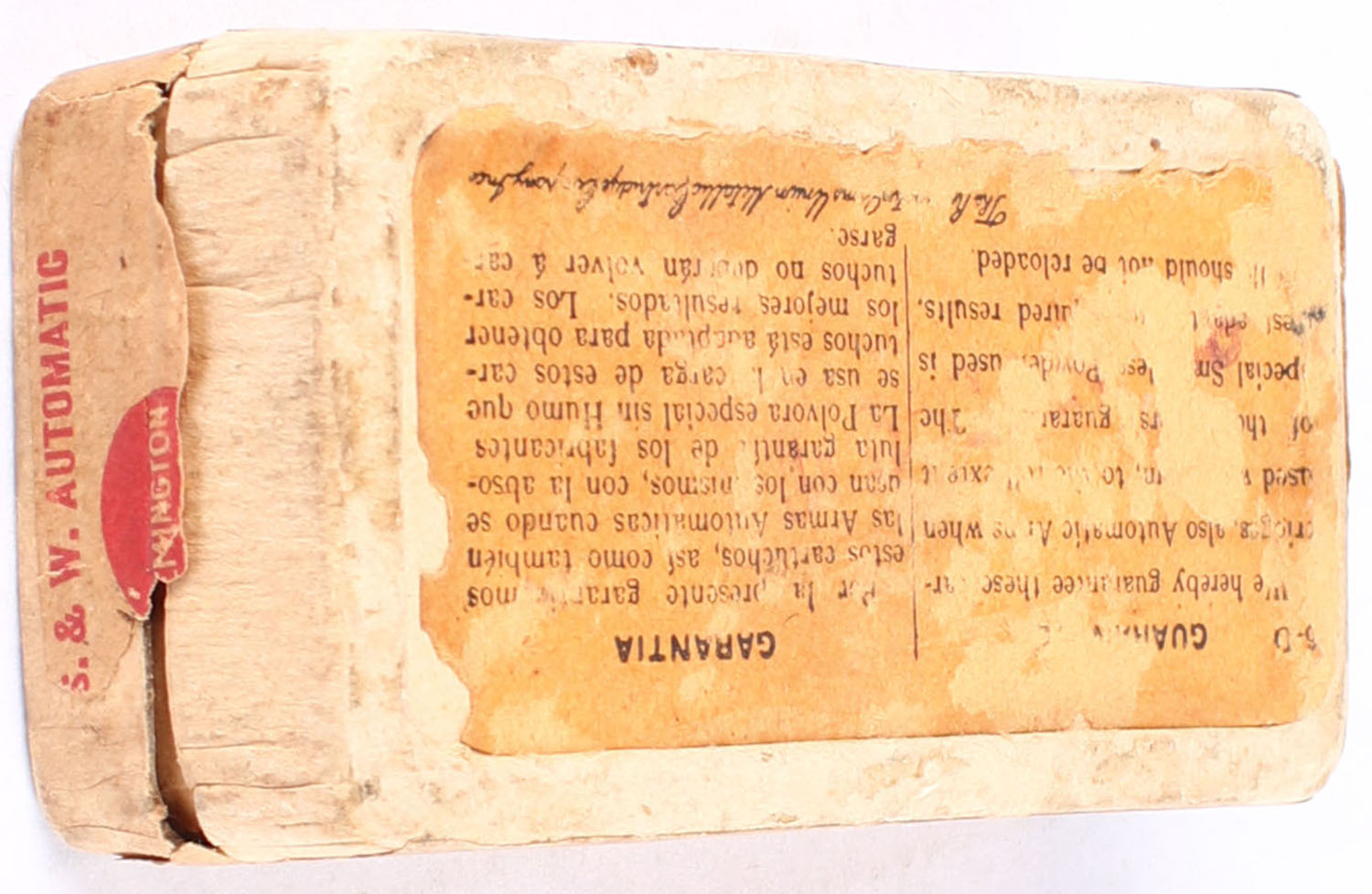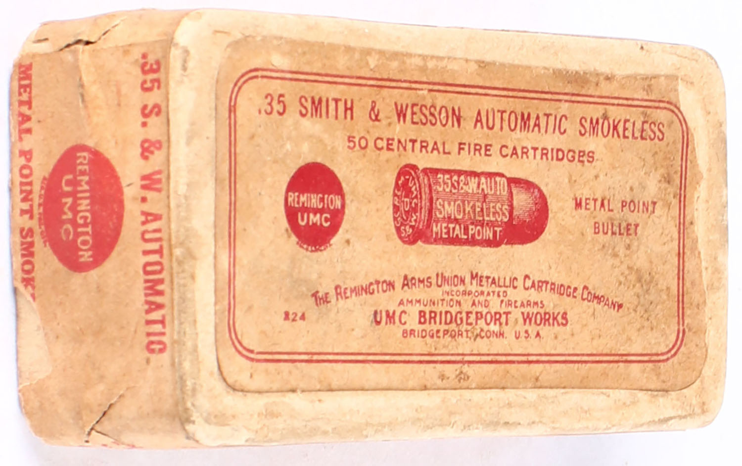 REM-UMC, .35 Smith & Wesson Automatic, Smokeless, Metal Point Bullet, FULL & SEALED, 2pc. Buff box with buff top & side sealing labels, box is solid with very good color &some age soiling, side sealing label is 95% intact. Grade: Very Good ++ - Value: 100 to 300