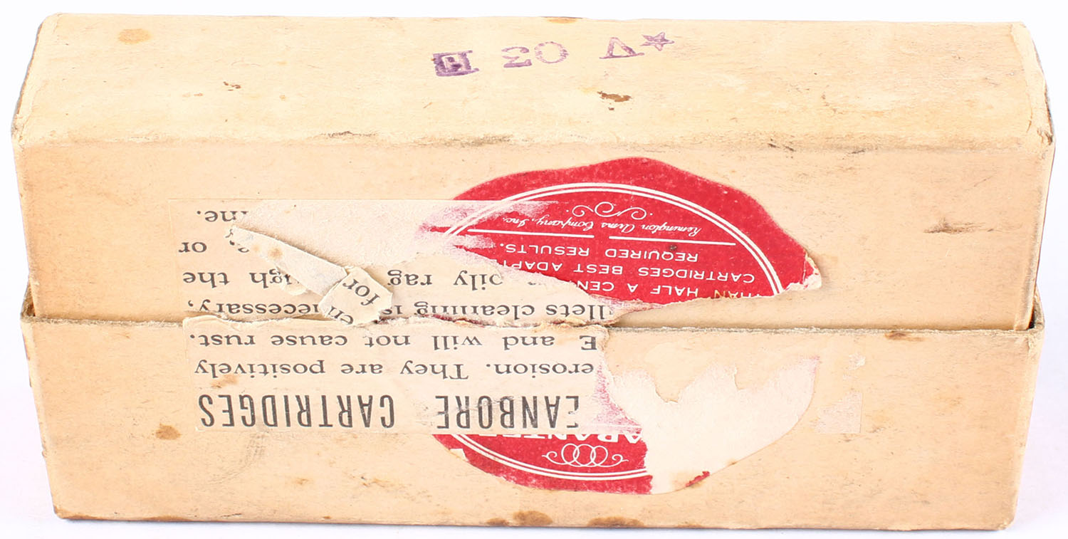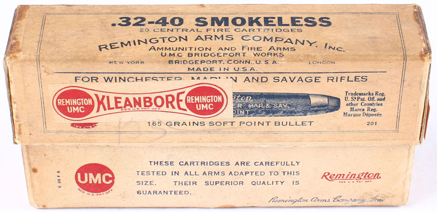 REM-UMC, .32-40 Smokeless, OVER LABEL ''KLEANBORE'', 165 Grain Soft Point Bullet, Partial 19rds., 2pc. Buff box with buff labels, box is solid with excellent color, minor age soiling, ammo is excellent. Grade: Excellent - Value: 30 to 90