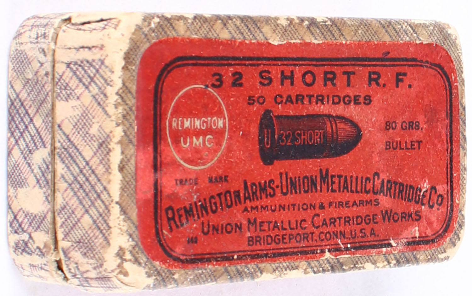 REM-UMC, .32 Short Rim Fire, Black Powder, Full, 2pc. Blue fabric box with red top & side sealing labels, box is solid with very good color, age soiling, shelf wear, edge & corner wear, labels are intact, ammo is good. Grade: Very Good ++ - Value: 30 to 90