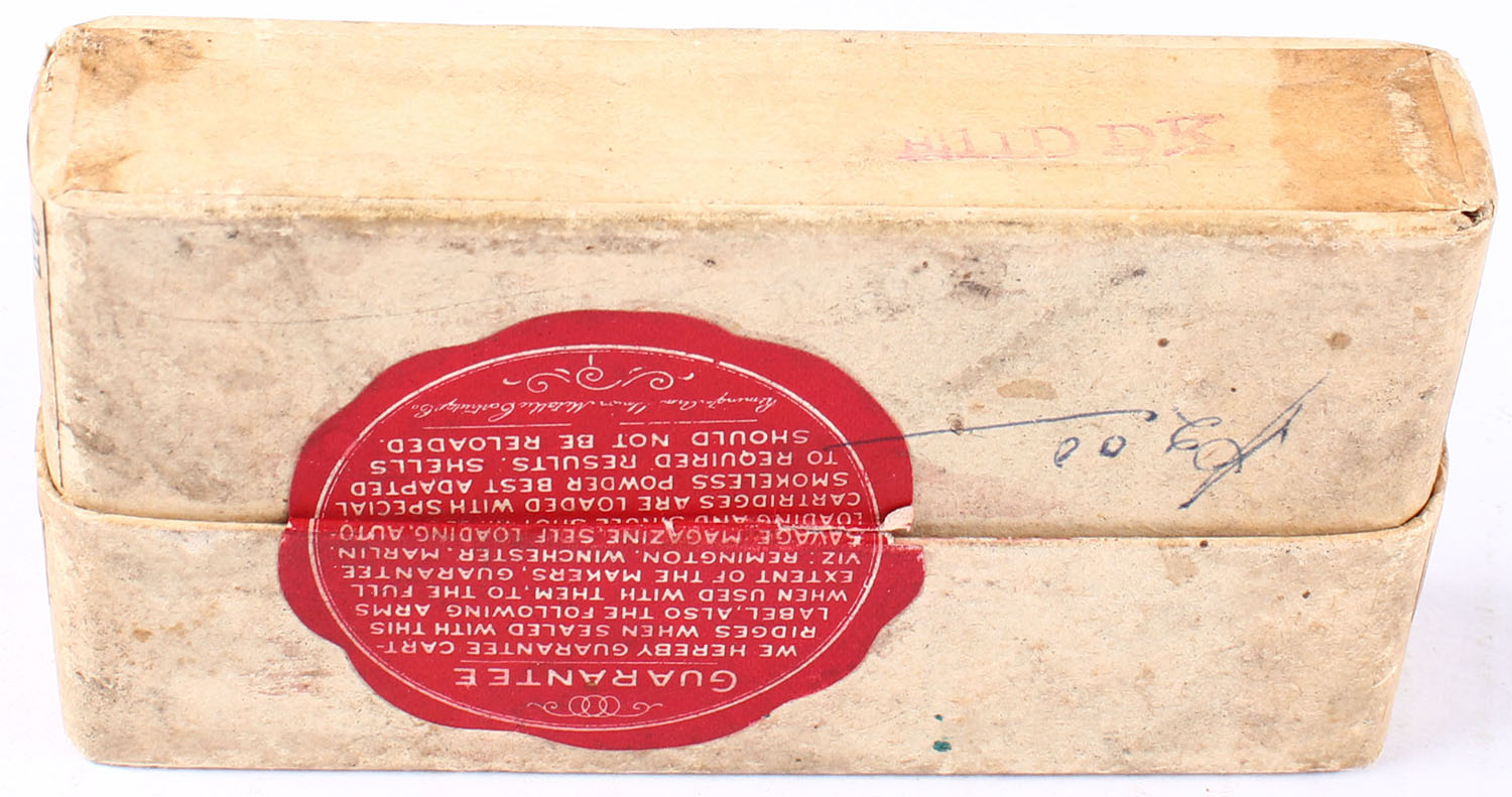 REM-UMC, .32 Remington, Smokeless Powder, 170 Grain Soft Point Bullet, FULL & SEALED, 2pc. Buff box with buff labels, box is solid with great color, minor age soiling, very minor edge & corner wear, front has been written on, labels are intact. Grade: Excellent - Value: 30 to 90