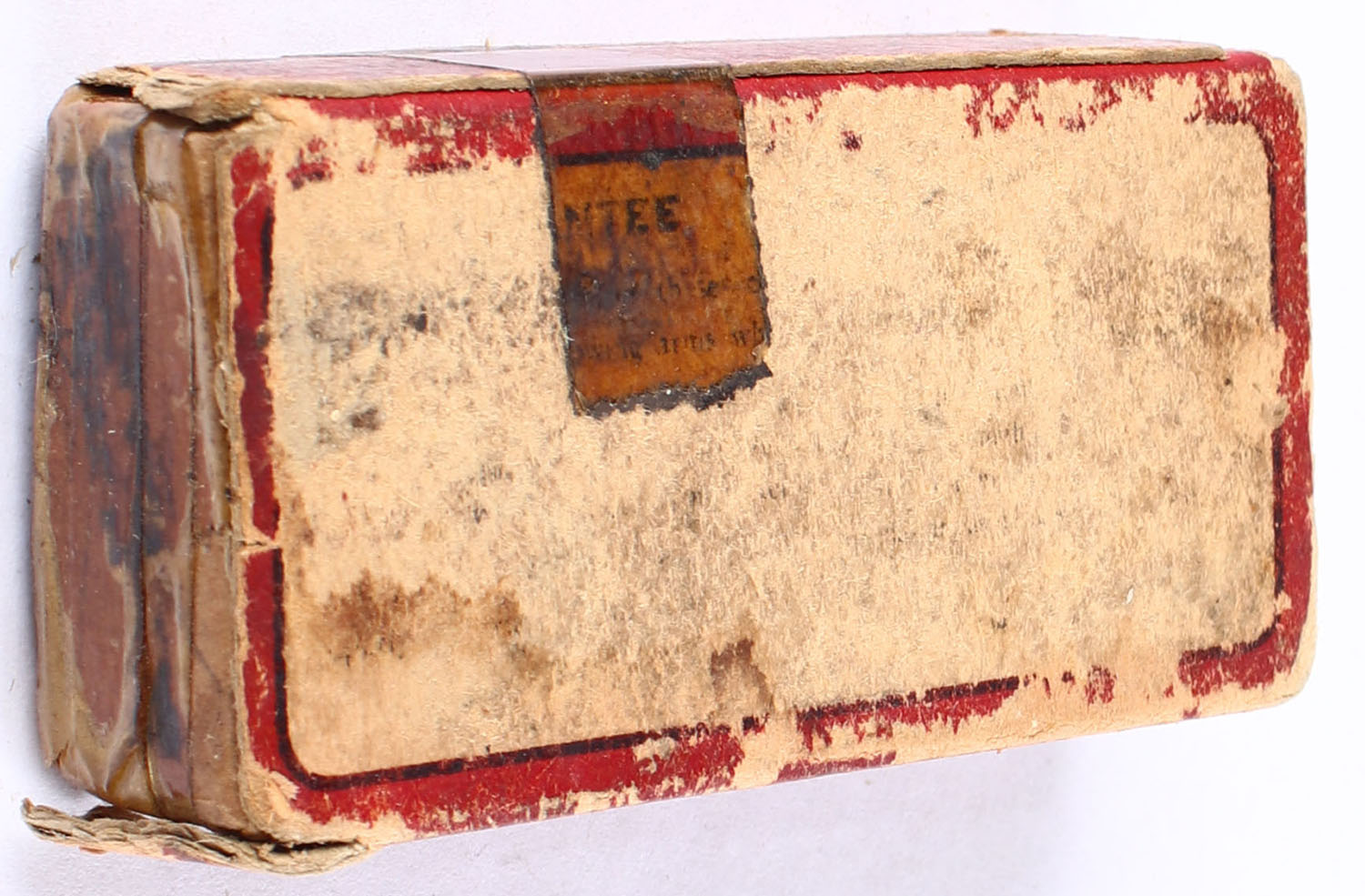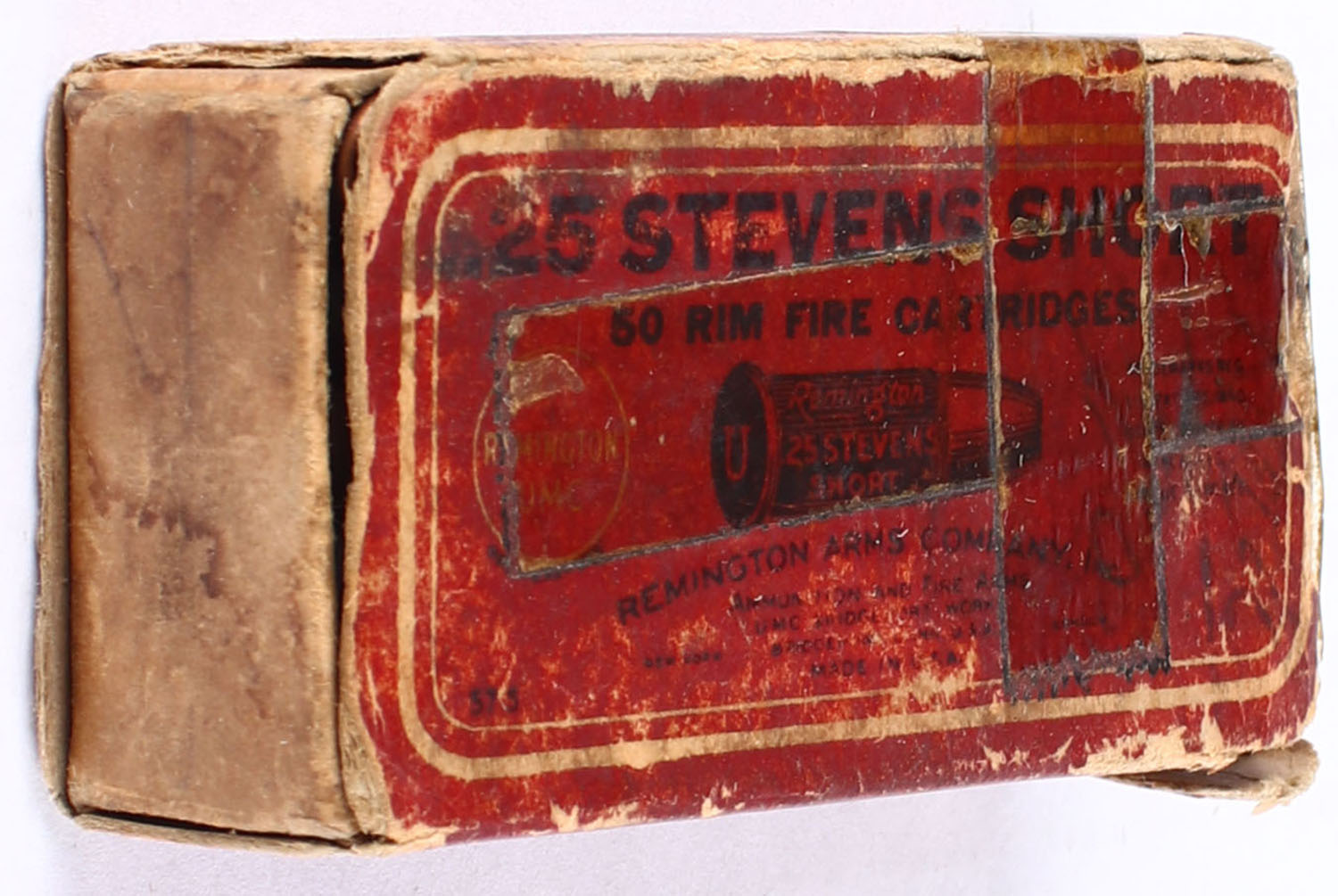 REM-UMC, .25 Stevens Short, Black Powder, Full, 1pc. Red black & white box, box is missing side flaps, has age soiling & scuffing, edge & corner wear, ammo is excellent. Grade: Good ++ - Value: 30 to 60