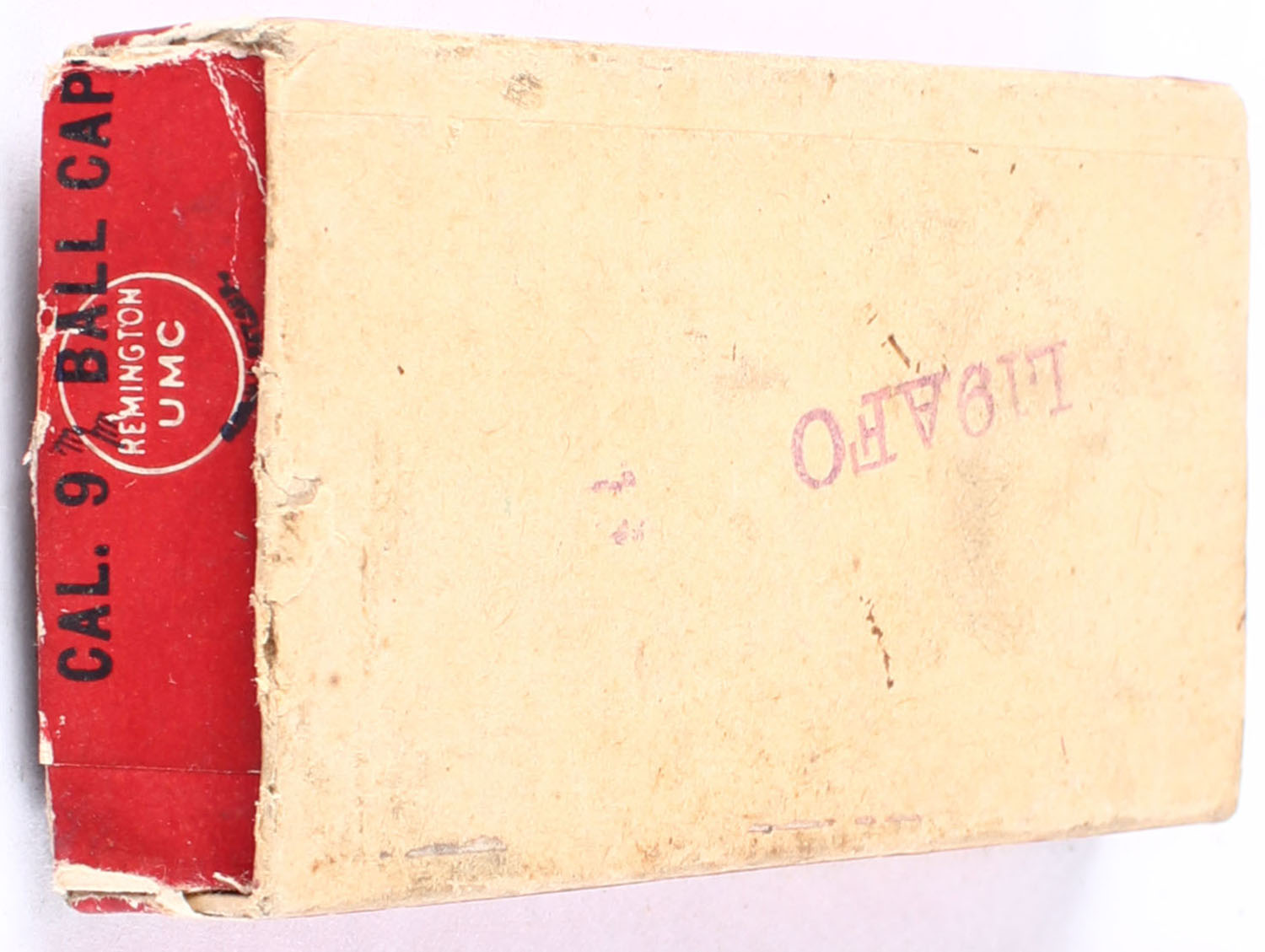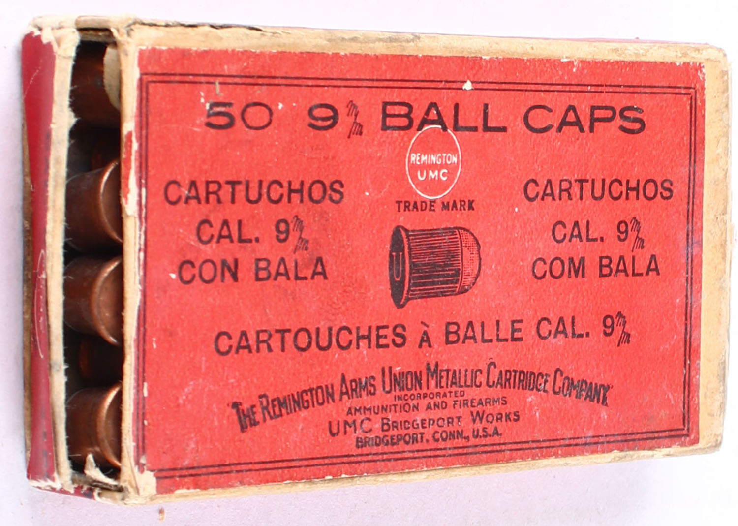 REM-UMC, 9mm Ball Caps, Rim Fire, Full, 1pc. Buff box with red top & side sealing labels, box is solid with excellent color, some age soiling, light edge & corer wear, box has seam splits to side flaps, ammo is very good to excellent. Grade: Very Good - Value: 30 to 90