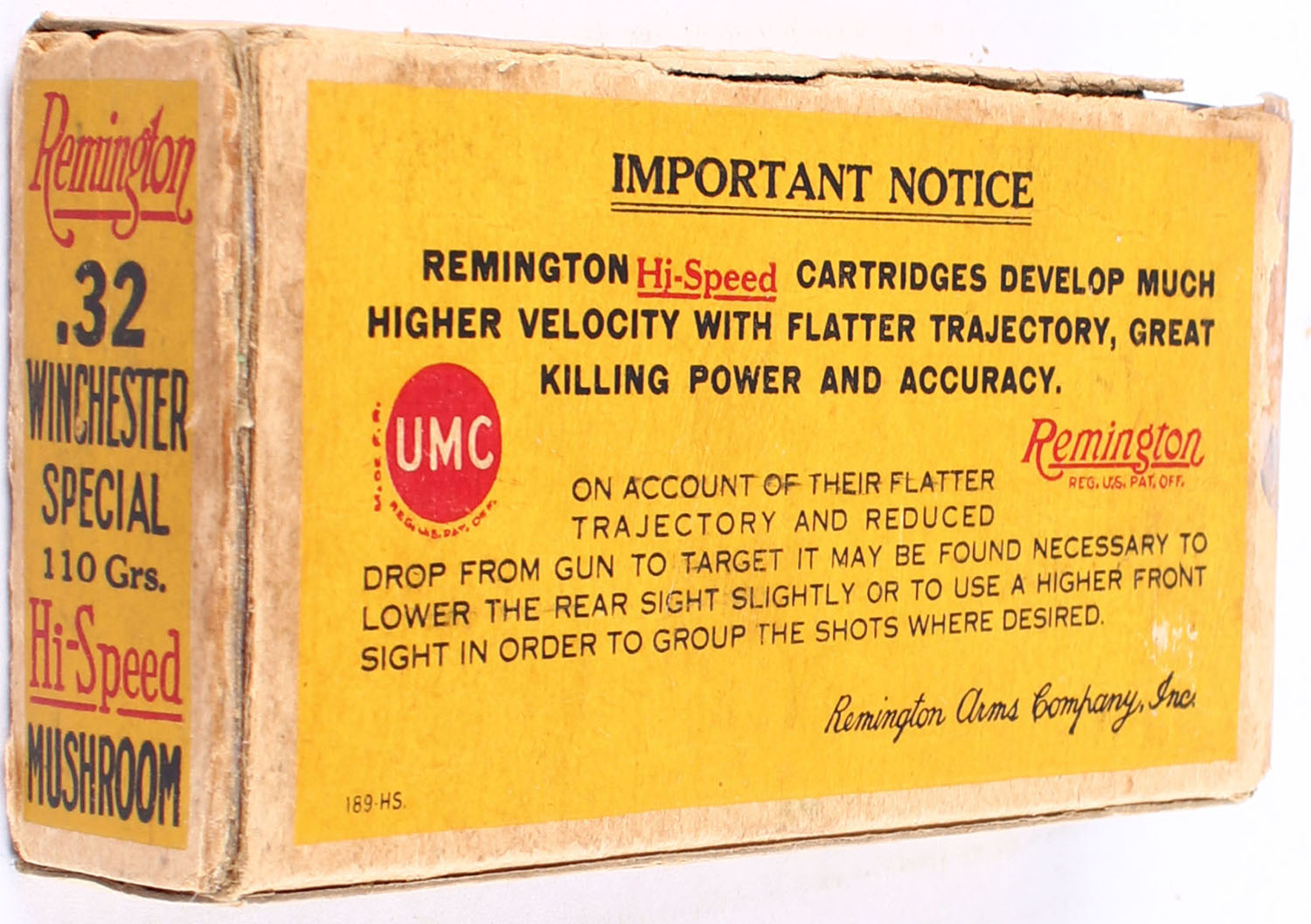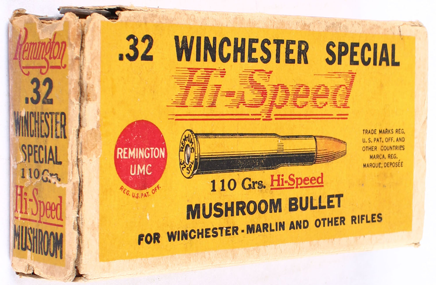 REM-UMC, Hi-Speed Mushroom, .32 Winchester Special, 110 Grain, Full, 1pc. Yellow buff & red box, box has age soiling & scuffing, edge & corner wear, has a partial tear to left side of box with a partial seam split to top, ammo is very good. Grade: Good ++ - Value: 80 to 250