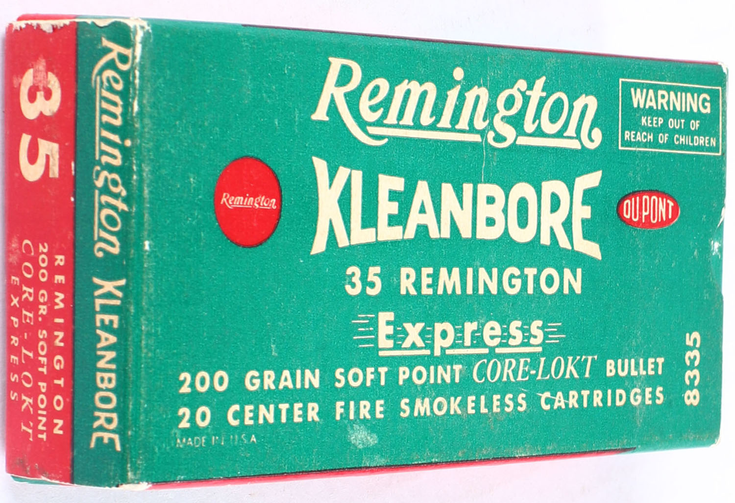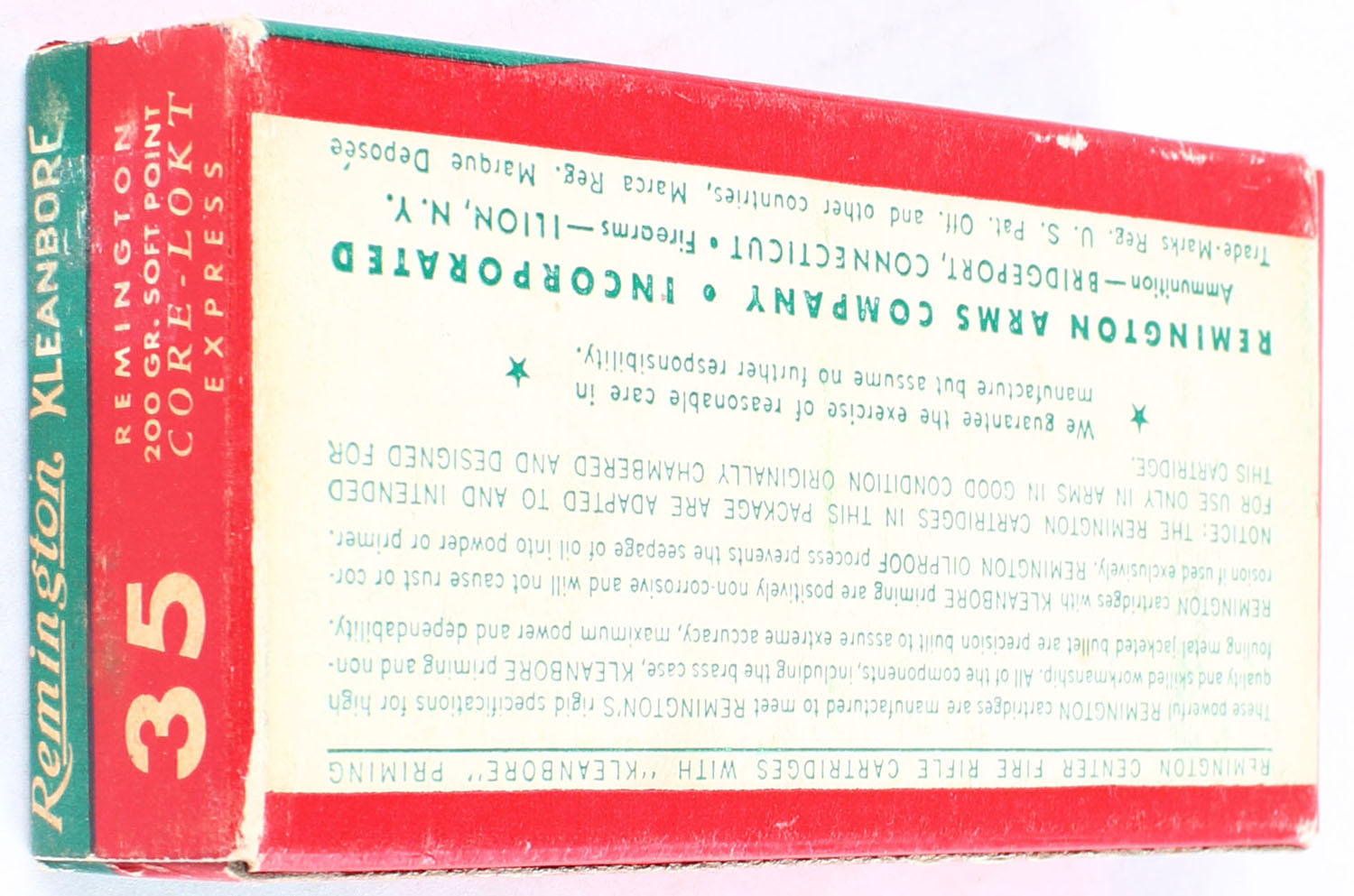 Remington, Kleanbore Express, .35 Remington, 200 Grain Soft Point Bullet, Full, 1pc. Green red & white box, box is very solid, end flaps are solid, ammo is mint. Grade: Excellent + - Value: 30 to 80