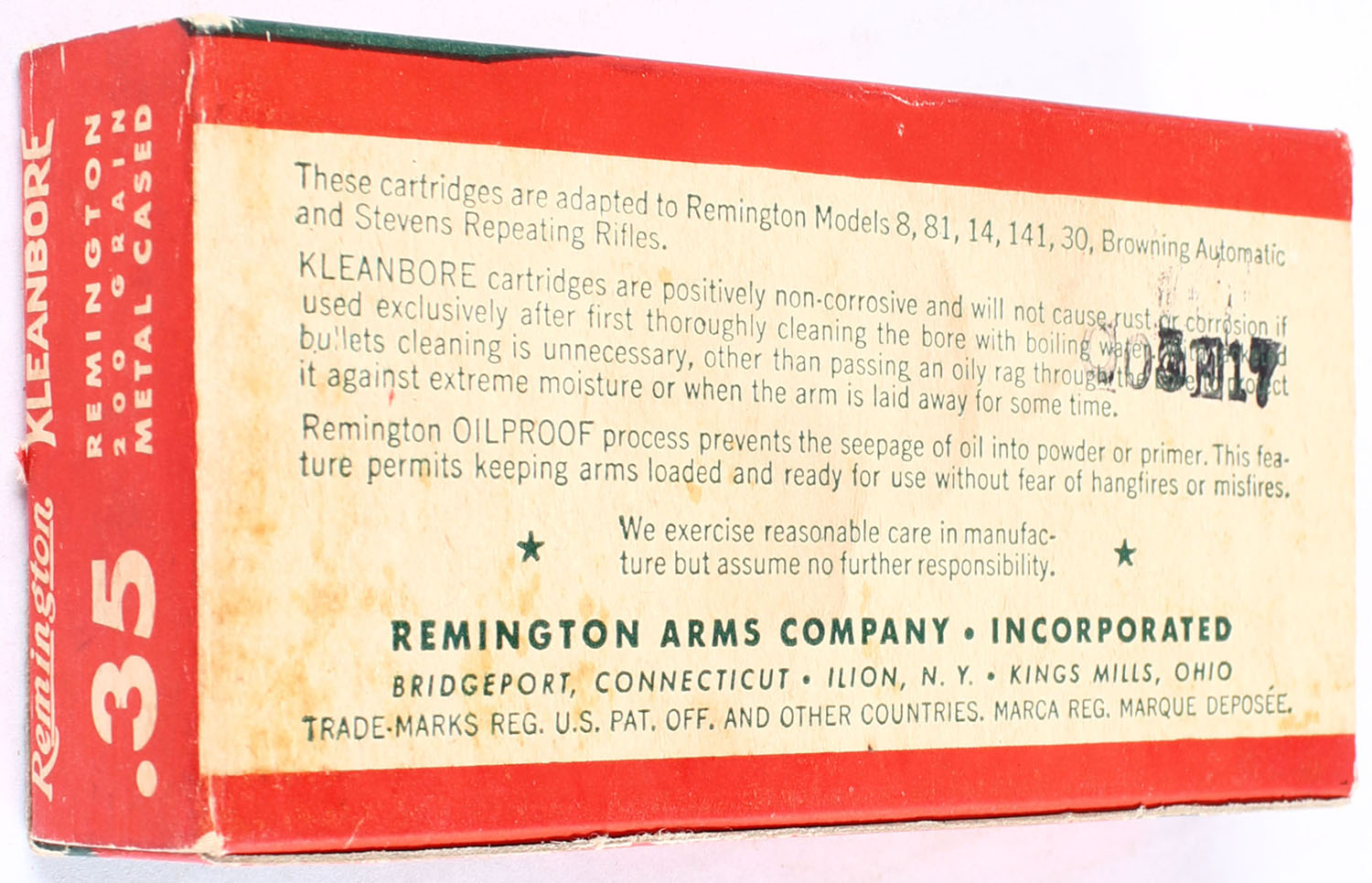 Remington, Kleanbore Express, .35 Remington, 200 Grain Soft Point Bullet, Full, 1pc. Green red & white box, box is very solid, end flaps are solid, ammo is mint. Grade: Excellent + - Value: 30 to 80