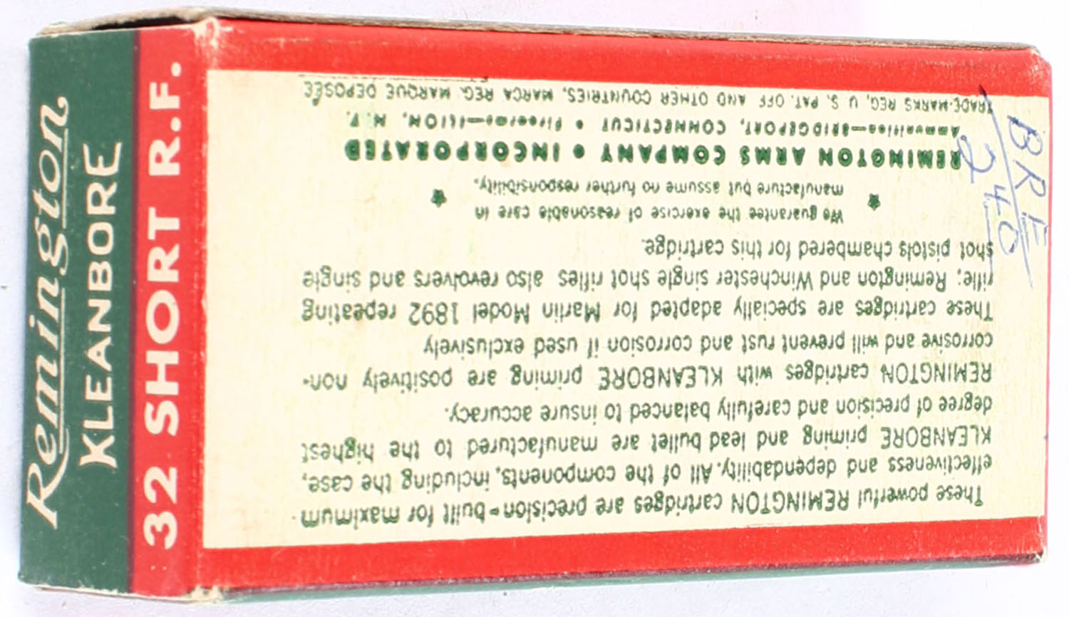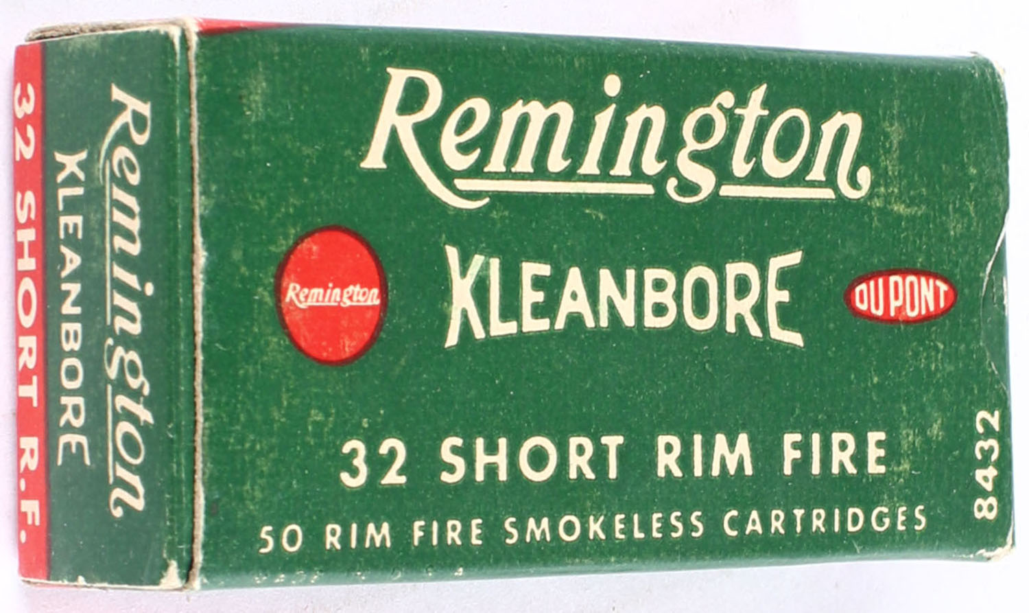 Remington, Kleanbore, .32 Short Rim Fire, Smokeless, Full, 1pc. Green white & red box, box is solid with excellent color, edges are mostly crisp, end flaps are solid, ammo is excellent. Grade: Excellent + - Value: 50 to 150