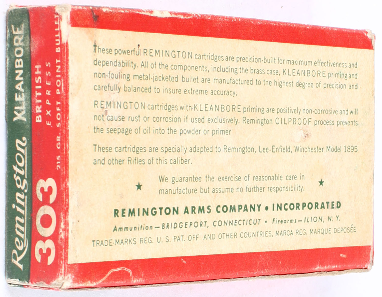 Remington, Kleanbore Express, .303 British, 215 Grain Soft Point Bullet, Full, 1pc. Green red & white box, box is very solid with some light wear, end flaps are solid, ammo is excellent. Grade: Excellent - Value: 30 to 90