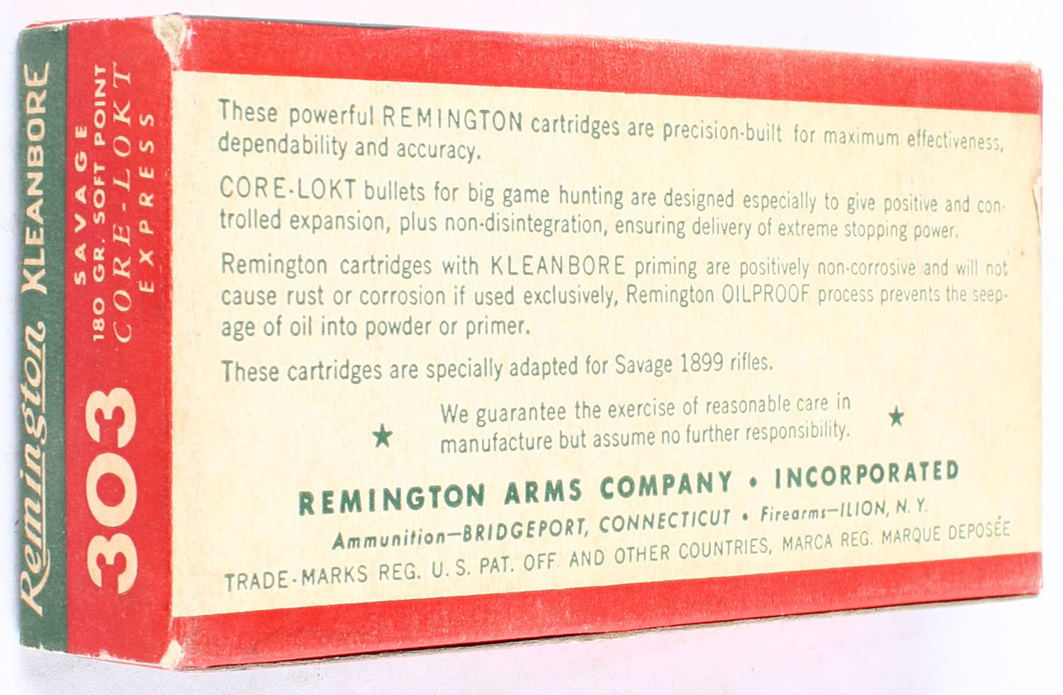 Remington, Kleanbore Express, .303 Savage, 180 Grain Soft Point Core-Lokt Bullet, Full, 1pc. Green red & white box, box is very solid with some fading, end flaps are solid, ammo is mint. Grade: Very Good ++ - Value: 20 to 80