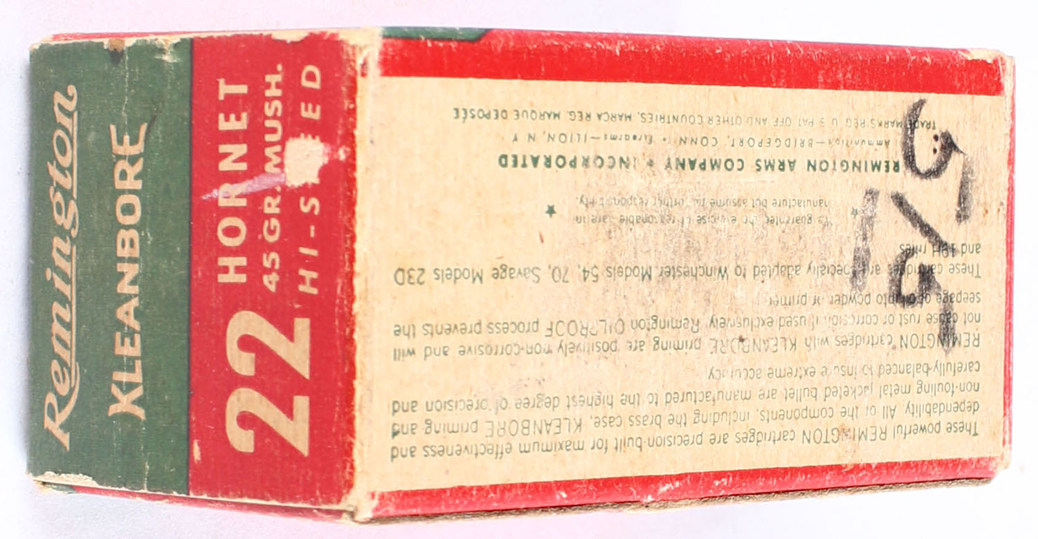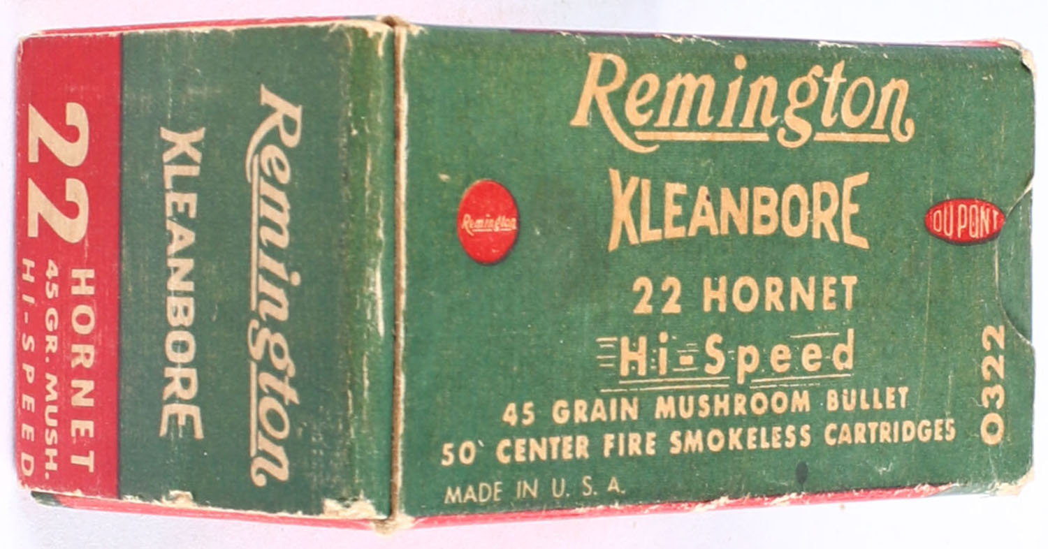 Remington, Kleanbore Hi-Speed, .22 Hornet, 45 Grain Mushroom Bullet, Full, 1pc. Green red & buff box, box is solid with excellent color, very minor age soiling, corner & edge wear, end flaps are solid, ammo is excellent. Grade: Excellent - Value: 70 to 100