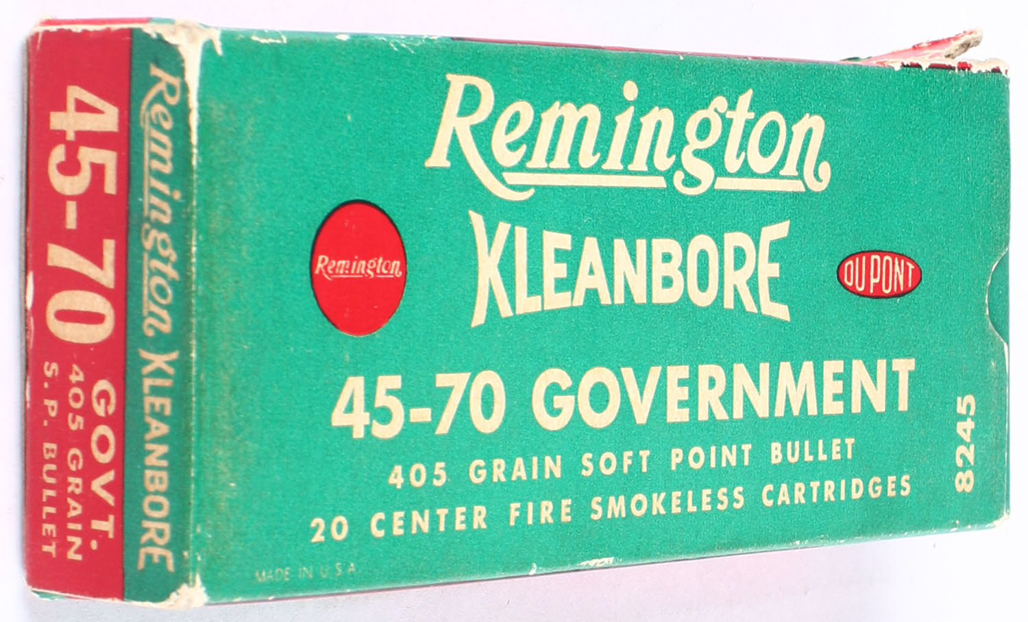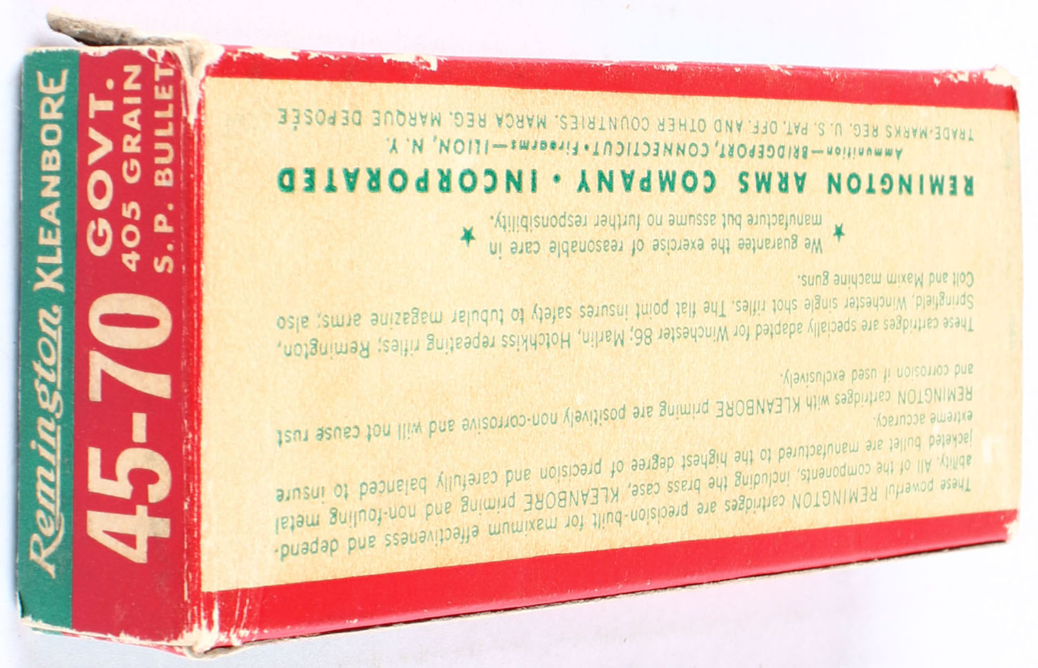 Remington, Kleanbore, .45-70 Government, 405 Grain Soft Point Bullet, Partial 8rds., 1pc. Green red & buff box, box is solid with excellent color, has edge & corner wear, ammo is very good. Grade: Very Good - Value: 10 to 20